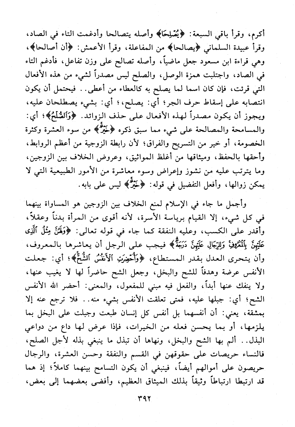 وأجمل ما جاء في الإِسلام لمنع الخلاف بين الزوجين هو المساواة بينهما في كل شيء، إلا القيام برياسة الأسرة، لأنه أقوى من المرأة بدنًا وعقلًا، وأقدر على الكسب، وعليه النفقة كما جاء في قوله تعالى: {وَلَهُنَّ مِثْلُ الَّذِي عَلَيْهِنَّ بِالْمَعْرُوفِ وَلِلرِّجَالِ عَلَيْهِنَّ دَرَجَةٌ} فيجب على الرجل أن يعاشرها بالمعروف، وأن يتحرى العدل بقدر المستطاع، {وَأُحْضِرَتِ الْأَنْفُسُ الشُّحَّ}؛ أي: جعلت الأنفس عرضة وهدفًا للشح والبخل، وجعل الشح حاضرًا لها لا يغيب عنها، ولا ينفك عنها أبدًا، والفعل فيه مبني للمفعول، والمعنى: أحضر الله الأنفس الشح؛ أي: جبلها عليه، فمتى تعلقت الأنفس بشيء منه .. فلا ترجع عنه إلا بمشقة، يعني: أن أنفسهما بل أنفس كل إنسان طبعت وجبلت على البخل بما يلزمها، أو بما يحسن فعله من الخيرات، فإذا عرض لها داع من دواعي البذل .. ألم بها الشح والبخل، ونهاها أن تبذل ما ينبغي بذله لأجل الصلح، فالنساء حريصات على حقوقهن في القسم والنفقة وحسن العشرة، والرجال حريصون على أموالهم أيضًا، فينبغي أن يكون التسامح بينهما كاملًا؛ إذ هما قد ارتبطا ارتباطًا وثيقًا بذلك الميثاق العظيم، وأفضى بعضهما إلى بعض،