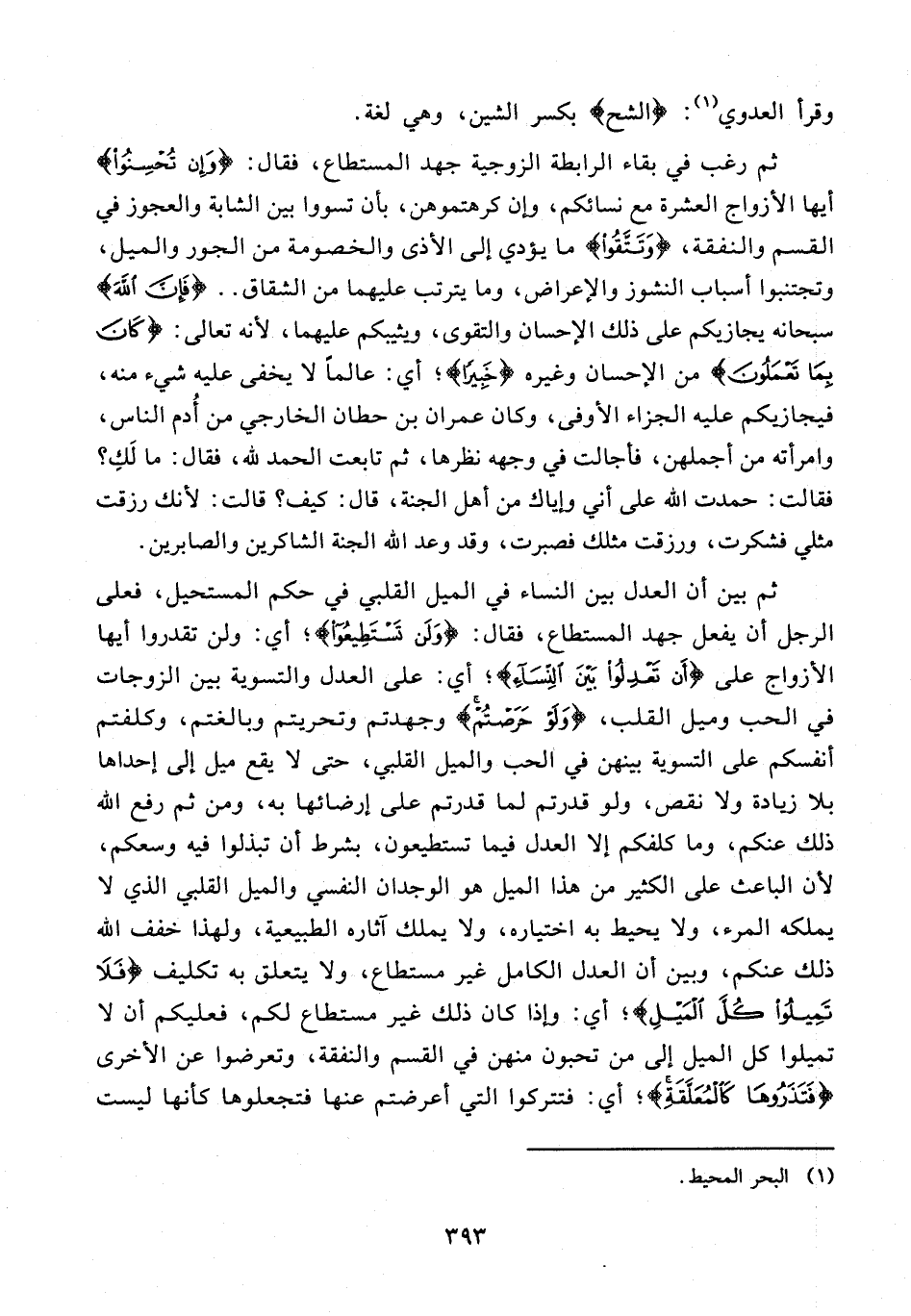 129 - ثم بين أن العدل بين النساء في الميل القلبي في حكم المستحيل، فعلى الرجل أن يفعل جهد المستطاع، فقال: {وَلَنْ تَسْتَطِيعُوا}؛ أي: ولن تقدروا أيها الأزواج على {أَنْ تَعْدِلُوا بَيْنَ النِّسَاءِ}؛ أي: على العدل والتسوية بين الزوجات في الحب وميل القلب، {وَلَوْ حَرَصْتُمْ} وجهدتم وتحريتم وبالغتم، وكلفتم أنفسكم على التسوية بينهن في الحب والميل القلبي، حتى لا يقع ميل إلى إحداها بلا زيادة ولا نقص، ولو قدرتم لما قدرتم على إرضائها به، ومن ثم رفع الله ذلك عنكم، وما كلفكم إلا العدل فيما تستطيعون، بشرط أن تبذلوا فيه وسعكم، لأن الباعث على الكثير من هذا الميل هو الوجدان النفسي والميل القلبي الذي لا يملكه المرء، ولا يحيط به اختياره، ولا يملك آثاره الطبيعية، ولهذا خفف الله ذلك عنكم، وبين أن العدل الكامل غير مستطاع، ولا يتعلق به تكليف {فَلَا تَمِيلُوا كُلَّ الْمَيْلِ}؛ أي: وإذا كان ذلك غير مستطاع لكم، فعليكم أن لا تميلوا كل الميل إلى من تحبون منهن في القسم والنفقة، وتعرضوا عن الأخرى {فَتَذَرُوهَا كَالْمُعَلَّقَةِ}؛ أي: فتتركوا التي أعرضتم عنها فتجعلوها كأنها ليست