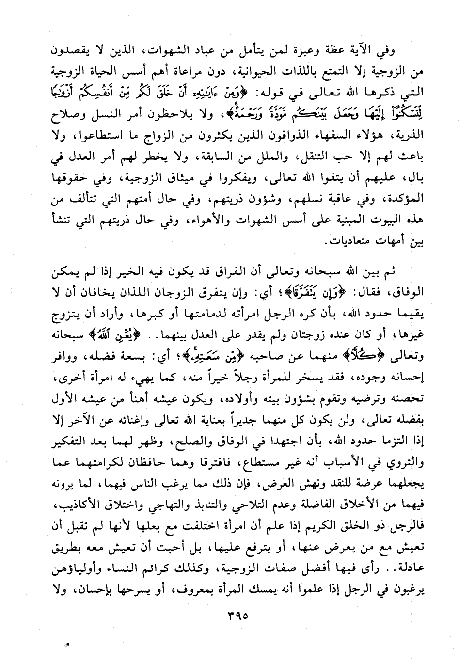 وفي الآية عظة وعبرة لمن يتأمل من عباد الشهوات، الذين لا يقصدون من الزوجية إلا التمتع باللذات الحيوانية، دون مراعاة أهم أسس الحياة الزوجية التي ذكرها الله تعالى في قوله: {وَمِنْ آيَاتِهِ أَنْ خَلَقَ لَكُمْ مِنْ أَنْفُسِكُمْ أَزْوَاجًا لِتَسْكُنُوا إِلَيْهَا وَجَعَلَ بَيْنَكُمْ مَوَدَّةً وَرَحْمَةً}، ولا يلاحظون أمر النسل وصلاح الذرية، هؤلاء السفهاء الذواقون الذين يكثرون من الزواج ما استطاعوا، ولا باعث لهم إلا حب التنقل، والملل من السابقة، ولا يخطر لهم أمر العدل في بال، عليهم أن يتقوا الله تعالى، ويفكروا في ميثاق الزوجية، وفي حقوقها المؤكدة، وفي عاقبة نسلهم، وشؤون ذريتهم، وفي حال أمتهم التي تتألف من هذه البيوت المبنية على أسس الشهوات والأهواء، وفي حال ذريتهم التي تنشأ بين أمهات متعاديات.