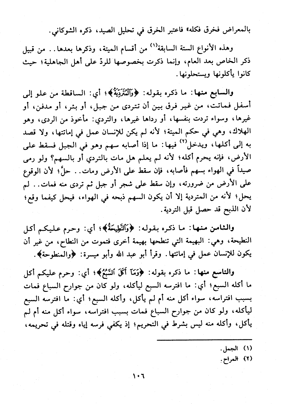 والسابع منها: ما ذكره بقوله: {وَالْمُتَرَدِّيَةُ}؛ أي: الساقطة من علو إلى أسفل فماتت، من غير فرق بين أن تتردى من جبل، أو بئر، أو مدفن، أو غيرها، وسواء تردت بنفسها، أو رداها غيرها، والتردي: مأخوذ من الردى، وهو الهلاك، وهي في حكم الميتة؛ لأنه لم يكن للإنسان عمل في إماتتها، ولا قصد به إلى أكلها، ويدخل (¬2) فيها: ما إذا أصابه سهم وهو في الجبل فسقط على الأرض، فإنه يحرم أكله؛ لأنه لم يعلم هل مات بالتردي أو بالسهم؟ ولو رمى صيدًا في الهواء بسهم فأصابه، فإن سقط على الأرض ومات .. حلَّ؛ لأن الوقوع على الأرض من ضرورته، وإن سقط على شجر أو جبل ثم تردى منه فمات .. لم يحل؛ لأنه من المتردية إلا أن يكون السهم ذبحه في الهواء، فيحل كيفما وقع؛ لأن الذبح قد حصل قبل التردية.