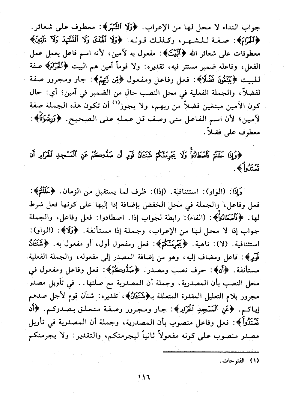جواب النداء لا محل لها من الإعراب. {وَلَا الشَّهْر}: معطوف على شعائر. {الْحَرَامَ}: صفة للشهر، وكذلك قوله: {وَلَا الْهَدْيَ وَلَا الْقَلَائِدَ وَلَا آمِّينَ} معطوفات على شعائر {الْبَيْتَ}: مفعول به لآمين، لأنه اسم فاعل يعمل عمل الفعل، وفاعله ضمير مستتر فيه، تقديره: ولا قومًا آمين هم البيت {الْحَرَامَ} صفة للبيت {يَبْتَغُونَ فَضْلًا}: فعل وفاعل ومفعول {مِنْ رَبِّهِمْ}: جار ومجرور صفة لفضلًا، والجملة الفعلية في محل النصب حال من الضمير في آمين؛ أي: حال كون الآمين مبتغين فضلًا من ربهم، ولا يجوز (¬1) أن تكون هذه الجملة صفة لآمين؛ لأن اسم الفاعل متى وصف قل عمله على الصحيح. {وَرِضْوَانًا}: معطوف على فضلًا.