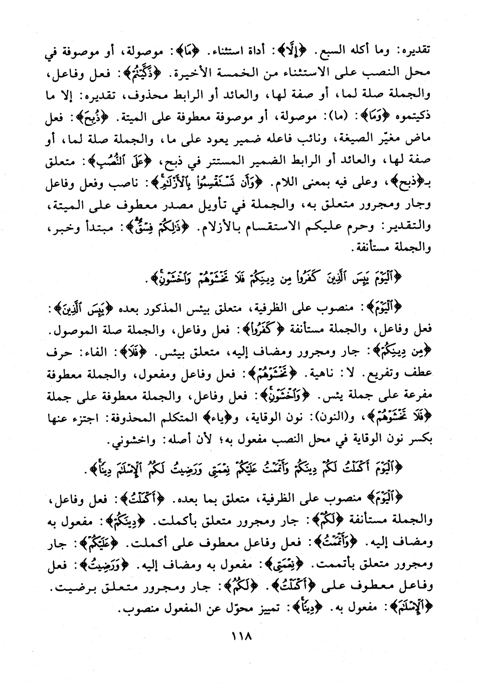 {الْيَوْمَ}: منصوب على الظرفية، متعلق بيئس المذكور بعده {يَئِسَ الَّذِينَ}: فعل وفاعل، والجملة مستأنفة {كَفَرُوا}: فعل وفاعل، والجملة صلة الموصول. {مِنْ دِينِكُمْ}: جار ومجرور ومضاف إليه، متعلق بيئس. {فَلَا}: الفاء: حرف عطف وتفريع. لا: ناهية. {تَخْشَوْهُمْ}: فعل وفاعل ومفعول، والجملة معطوفة مفرعة على جملة يئس. {وَاخْشَوْنِ}: فعل وفاعل، والجملة معطوفة على جملة {فَلَا تَخْشَوْهُمْ}، و (النون): نون الوقاية، و {ياء} المتكلم المحذوفة: اجتزء عنها بكسر نون الوقاية في محل النصب مفعول به؛ لأن أصله: واخشوني.