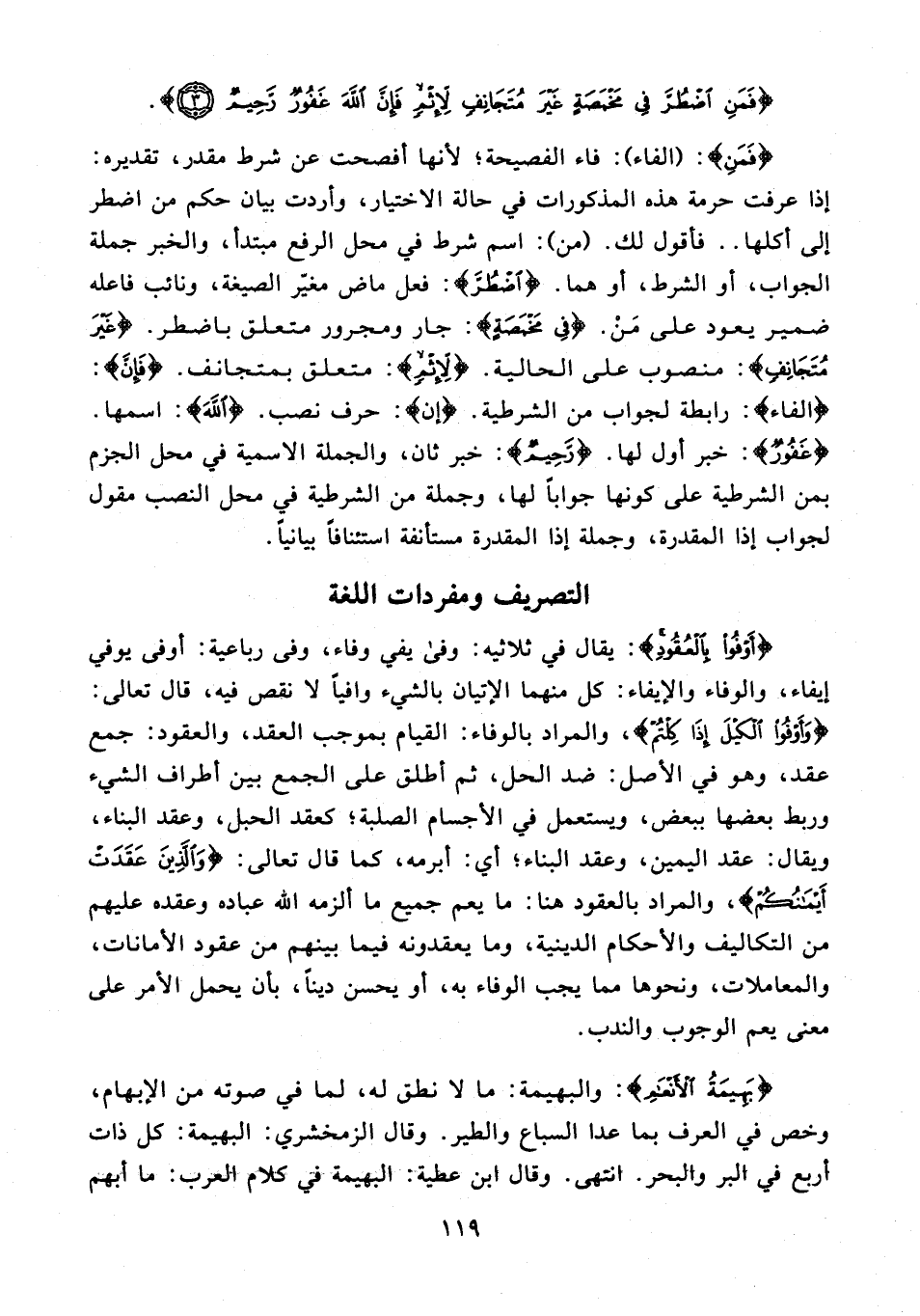 {فَمَنِ}: (الفاء): فاء الفصيحة؛ لأنها أفصحت عن شرط مقدر، تقديره: إذا عرفت حرمة هذه المذكورات في حالة الاختيار، وأردت بيان حكم من اضطر إلى أكلها .. فأقول لك. (من): اسم شرط في محل الرفع مبتدأ، والخبر جملة الجواب، أو الشرط، أو هما. {اضْطُرَّ}: فعل ماض مغيّر الصيغة، ونائب فاعله ضمير يعود على مَنْ. {فِي مَخْمَصَةٍ}: جار ومجرور متعلق باضطر. {غَيْرَ مُتَجَانِفٍ}: منصوب على الحالية. {لِإِثْمٍ}: متعلق بمتجانف. {فَإِنَّ}: {الفاء}: رابطة لجواب من الشرطية. {إن}: حرف نصب. {اللَّهَ}: اسمها. {غَفُورٌ}: خبر أول لها. {رَحِيمٌ}: خبر ثان، والجملة الإسمية في محل الجزم بمن الشرطية على كونها جوابًا لها، وجملة من الشرطية في محل النصب مقول لجواب إذا المقدرة، وجملة إذا المقدرة مستأنفة استئنافًا بيانيًّا.