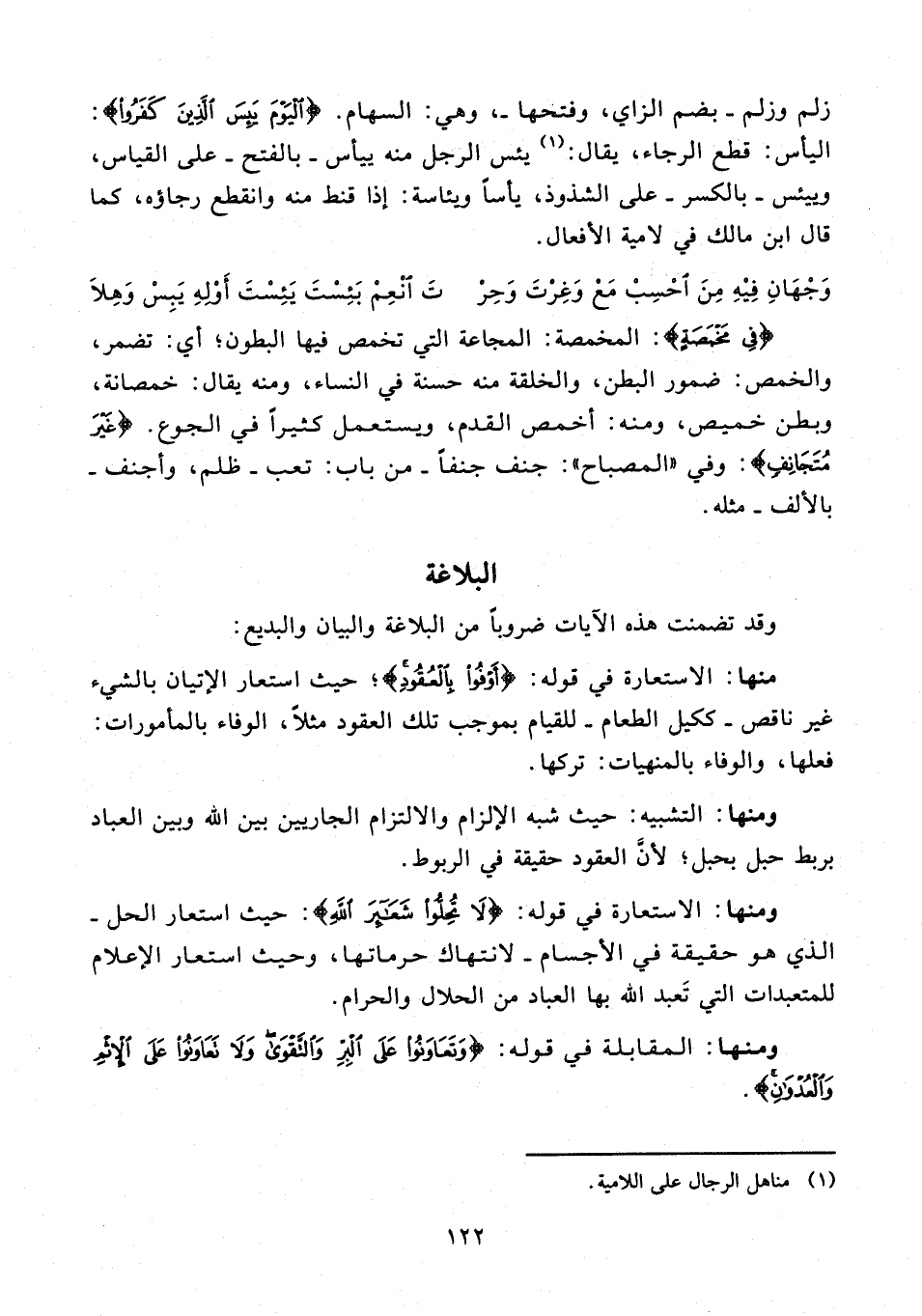 {فِي مَخْمَصَةٍ}: المخمصة: المجاعة التي تخمص فيها البطون؛ أي: تضمر، والخمص: ضمور البطن، والخلقة منه حسنة في النساء، ومنه يقال: خمصانة، وبطن خميص، ومنه: أخمص القدم، ويستعمل كثيرًا في الجوع. {غَيْرَ مُتَجَانِفٍ}: وفي، المصباح: جنف جنفًا - من باب: تعب - ظلم، وأجنف - بالألف - مثله.