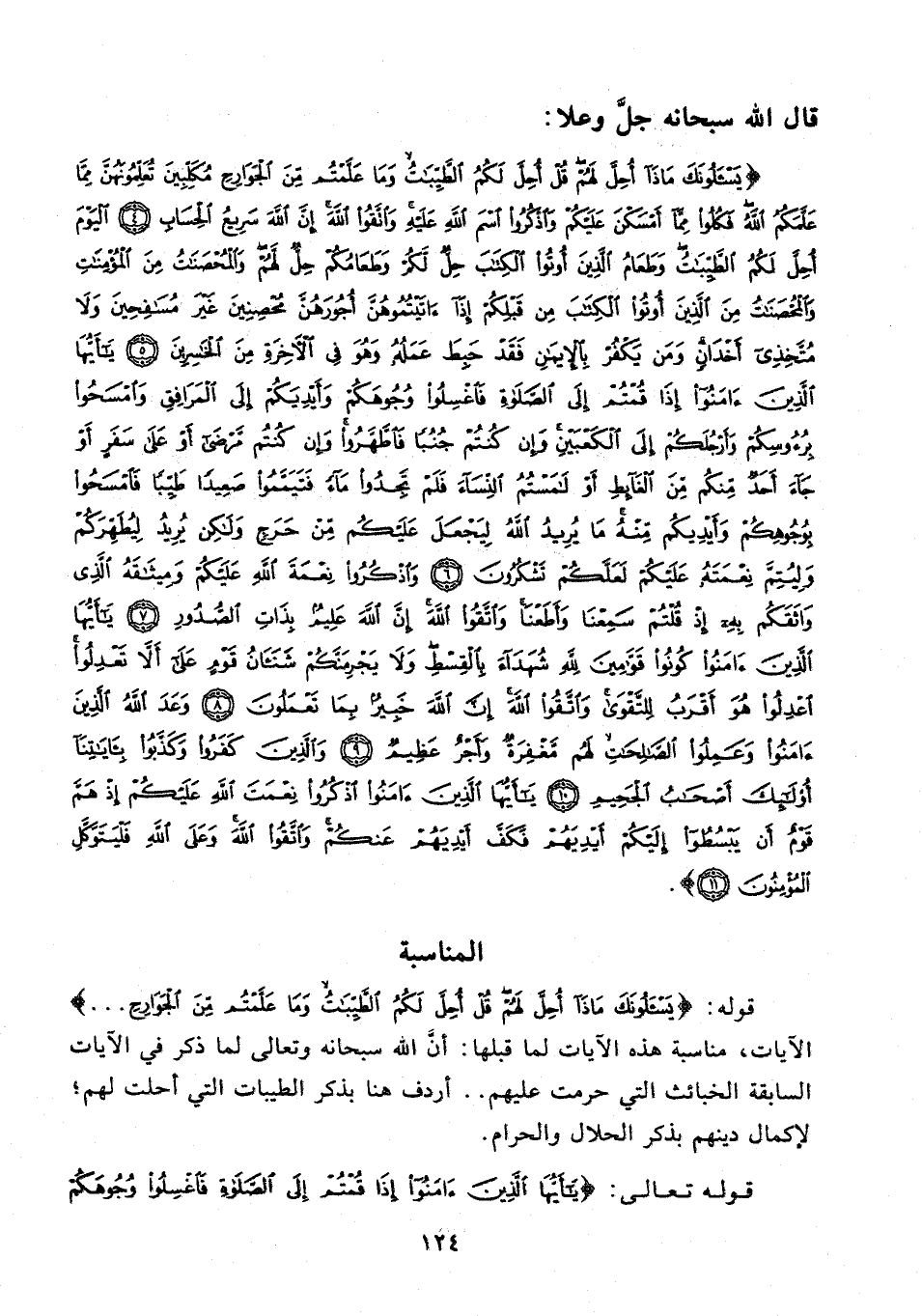 {يَسْأَلُونَكَ مَاذَا أُحِلَّ لَهُمْ قُلْ أُحِلَّ لَكُمُ الطَّيِّبَاتُ وَمَا عَلَّمْتُمْ مِنَ الْجَوَارِحِ مُكَلِّبِينَ تُعَلِّمُونَهُنَّ مِمَّا عَلَّمَكُمُ اللَّهُ فَكُلُوا مِمَّا أَمْسَكْنَ عَلَيْكُمْ وَاذْكُرُوا اسْمَ اللَّهِ عَلَيْهِ وَاتَّقُوا اللَّهَ إِنَّ اللَّهَ سَرِيعُ الْحِسَابِ (4) الْيَوْمَ أُحِلَّ لَكُمُ الطَّيِّبَاتُ وَطَعَامُ الَّذِينَ أُوتُوا الْكِتَابَ حِلٌّ لَكُمْ وَطَعَامُكُمْ حِلٌّ لَهُمْ وَالْمُحْصَنَاتُ مِنَ الْمُؤْمِنَاتِ وَالْمُحْصَنَاتُ مِنَ الَّذِينَ أُوتُوا الْكِتَابَ مِنْ قَبْلِكُمْ إِذَا آتَيْتُمُوهُنَّ أُجُورَهُنَّ مُحْصِنِينَ غَيْرَ مُسَافِحِينَ وَلَا مُتَّخِذِي أَخْدَانٍ وَمَنْ يَكْفُرْ بِالْإِيمَانِ فَقَدْ حَبِطَ عَمَلُهُ وَهُوَ فِي الْآخِرَةِ مِنَ الْخَاسِرِينَ (5) يَا أَيُّهَا الَّذِينَ آمَنُوا إِذَا قُمْتُمْ إِلَى الصَّلَاةِ فَاغْسِلُوا وُجُوهَكُمْ وَأَيْدِيَكُمْ إِلَى الْمَرَافِقِ وَامْسَحُوا بِرُءُوسِكُمْ وَأَرْجُلَكُمْ إِلَى الْكَعْبَيْنِ وَإِنْ كُنْتُمْ جُنُبًا فَاطَّهَّرُوا وَإِنْ كُنْتُمْ مَرْضَى أَوْ عَلَى سَفَرٍ أَوْ جَاءَ أَحَدٌ مِنْكُمْ مِنَ الْغَائِطِ أَوْ لَامَسْتُمُ النِّسَاءَ فَلَمْ تَجِدُوا مَاءً فَتَيَمَّمُوا صَعِيدًا طَيِّبًا فَامْسَحُوا بِوُجُوهِكُمْ وَأَيْدِيكُمْ مِنْهُ مَا يُرِيدُ اللَّهُ لِيَجْعَلَ عَلَيْكُمْ مِنْ حَرَجٍ وَلَكِنْ يُرِيدُ لِيُطَهِّرَكُمْ وَلِيُتِمَّ نِعْمَتَهُ عَلَيْكُمْ لَعَلَّكُمْ تَشْكُرُونَ (6) وَاذْكُرُوا نِعْمَةَ اللَّهِ عَلَيْكُمْ وَمِيثَاقَهُ الَّذِي وَاثَقَكُمْ بِهِ إِذْ قُلْتُمْ سَمِعْنَا وَأَطَعْنَا وَاتَّقُوا اللَّهَ إِنَّ اللَّهَ عَلِيمٌ بِذَاتِ الصُّدُورِ (7) يَا أَيُّهَا الَّذِينَ آمَنُوا كُونُوا قَوَّامِينَ لِلَّهِ شُهَدَاءَ بِالْقِسْطِ وَلَا يَجْرِمَنَّكُمْ شَنَآنُ قَوْمٍ عَلَى أَلَّا تَعْدِلُوا اعْدِلُوا هُوَ أَقْرَبُ لِلتَّقْوَى وَاتَّقُوا اللَّهَ إِنَّ اللَّهَ خَبِيرٌ بِمَا تَعْمَلُونَ (8) وَعَدَ اللَّهُ الَّذِينَ آمَنُوا وَعَمِلُوا الصَّالِحَاتِ لَهُمْ مَغْفِرَةٌ وَأَجْرٌ عَظِيمٌ (9) وَالَّذِينَ كَفَرُوا وَكَذَّبُوا بِآيَاتِنَا أُولَئِكَ أَصْحَابُ الْجَحِيمِ (10) يَا أَيُّهَا الَّذِينَ آمَنُوا اذْكُرُوا نِعْمَتَ اللَّهِ عَلَيْكُمْ إِذْ هَمَّ قَوْمٌ أَنْ يَبْسُطُوا إِلَيْكُمْ أَيْدِيَهُمْ فَكَفَّ أَيْدِيَهُمْ عَنْكُمْ وَاتَّقُوا اللَّهَ وَعَلَى اللَّهِ فَلْيَتَوَكَّلِ الْمُؤْمِنُونَ (11)}.