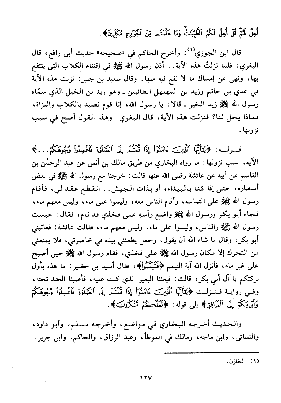 قوله: {يَا أَيُّهَا الَّذِينَ آمَنُوا إِذَا قُمْتُمْ إِلَى الصَّلَاةِ فَاغْسِلُوا وُجُوهَكُمْ ...} الآية، سبب نزولها: ما رواه البخاري من طريق مالك بن أنس عن عبد الرحمن بن القاسم عن أبيه عن عائشة - رضي الله عنها - قالت: خرجنا مع رسول الله - صلى الله عليه وسلم - في بعض أسفاره، حتى إذا كنا بالبيداء، أو بذات الجيش .. انقطع عقد لي، فأقام رسول الله - صلى الله عليه وسلم - على التماسه، وأقام الناس معه، وليسوا على ماء، وليس معهم ماء، فجاء أبو بكر ورسول الله - صلى الله عليه وسلم - واضع رأسه على فخذي قد نام، فقال: حبست رسول الله - صلى الله عليه وسلم - والناس، وليسوا على ماء، وليس معهم ماء، فقالت عائشة: فعاتبني أبو بكر، وقال ما شاء الله أن يقول، وجعل يطعنني بيده في خاصرتي، فلا يمنعني من التحرك إلا مكان رسول الله - صلى الله عليه وسلم - على فخذي، فقام رسول الله - صلى الله عليه وسلم - حين أصبح على غير ماء، فأنزل الله آية التيمم {فَتَيَمَّمُوا}، فقال أسيد بن حضير: ما هذه بأول بركتكم يا آل أبي بكر، قالت: فبعثنا البعير الذي كنت عليه، فأصبنا العقد تحته، وفي رواية فنزلت {يَا أَيُّهَا الَّذِينَ آمَنُوا إِذَا قُمْتُمْ إِلَى الصَّلَاةِ فَاغْسِلُوا وُجُوهَكُمْ وَأَيْدِيَكُمْ إِلَى الْمَرَافِقِ} إلى قوله: {لَعَلَّكُمْ تَشْكُرُونَ}.