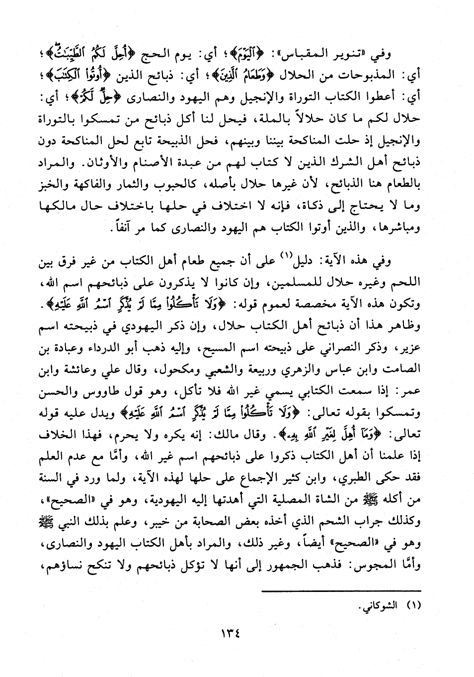 وفي هذه الآية: دليل (¬1) على أن جميع طعام أهل الكتاب من غير فرق بين اللحم وغيره حلال للمسلمين، وإن كانوا لا يذكرون على ذبائحهم اسم الله، وتكون هذه الآية مخصصة لعموم قوله: {وَلَا تَأكُلُوا مِمَّا لَمْ يُذْكَرِ اسْمُ اللَّهِ عَلَيْهِ}. وظاهر هذا أن ذبائح أهل الكتاب حلال، وإن ذكر اليهودي في ذبيحته اسم عزير، وذكر النصراني على ذبيحته اسم المسيح، وإليه ذهب أبو الدرداء وعبادة بن الصامت وابن عباس والزهري وربيعة والشعبي ومكحول، وقال علي وعائشة وابن عمر: إذا سمعت الكتابي يسمي غير الله فلا تأكل، وهو قول طاووس والحسن وتمسكوا بقوله تعالى: {وَلَا تَأكُلُوا مِمَّا لَمْ يُذْكَرِ اسْمُ اللَّهِ عَلَيْهِ} ويدل عليه قوله تعالى: {وَمَا أُهِلَّ لِغَيْرِ اللَّهِ بِهِ}. وقال مالك: إنه يكره ولا يحرم، فهذا الخلاف إذا علمنا أن أهل الكتاب ذكروا على ذبائحهم اسم غير الله، وأمَّا مع عدم العلم فقد حكى الطبري، وابن كثير الإجماع على حلها لهذه الآية، ولما ورد في السنة من أكله - صلى الله عليه وسلم - من الشاة المصلية التي أهدتها إليه اليهودية، وهو في "الصحيح"، وكذلك جراب الشحم الذي أخذه بعض الصحابة من خيبر، وعلم بذلك النبي - صلى الله عليه وسلم - وهو في "الصحيح" أيضًا، وغير ذلك، والمراد بأهل الكتاب اليهود والنصارى، وأمَّا المجوس: فذهب الجمهور إلى أنها لا تؤكل ذبائحهم ولا تنكح نساؤهم،