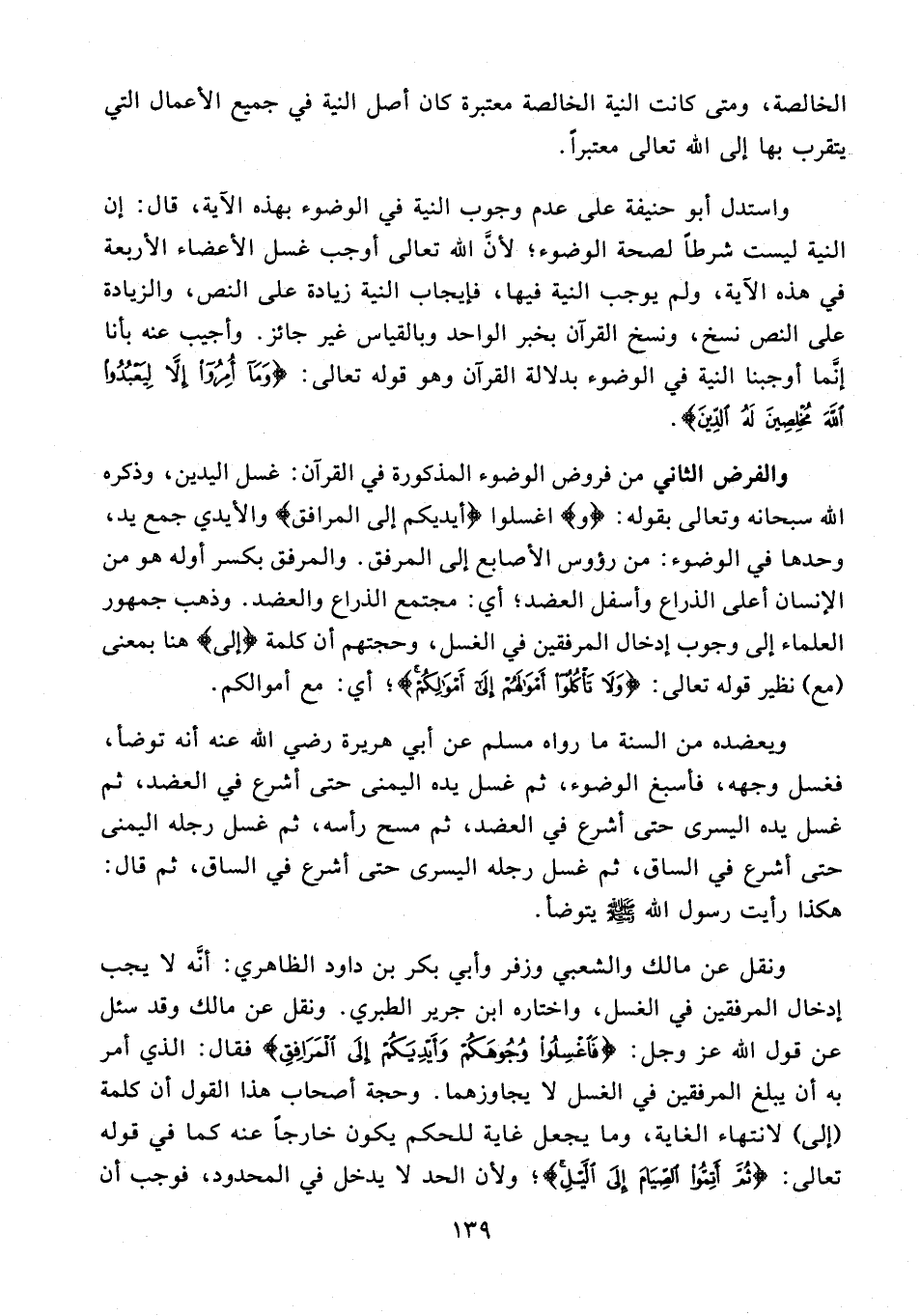 واستدل أبو حنيفة على عدم وجوب النية في الوضوء بهذه الآية، قال: إن النية ليست شرطًا لصحة الوضوء؛ لأنَّ الله تعالى أوجب غسل الأعضاء الأربعة في هذه الآية، ولم يوجب النية فيها، فإيجاب النية زيادة على النص، والزيادة على النص نسخ، ونسخ القرآن بخبر الواحد وبالقياس غير جائز. وأجيب عنه بأنا إنَّما أوجبنا النية في الوضوء بدلالة القرآن وهو قوله تعالى: {وَمَا أُمِرُوا إِلَّا لِيَعْبُدُوا اللَّهَ مُخْلِصِينَ لَهُ الدِّينَ}.