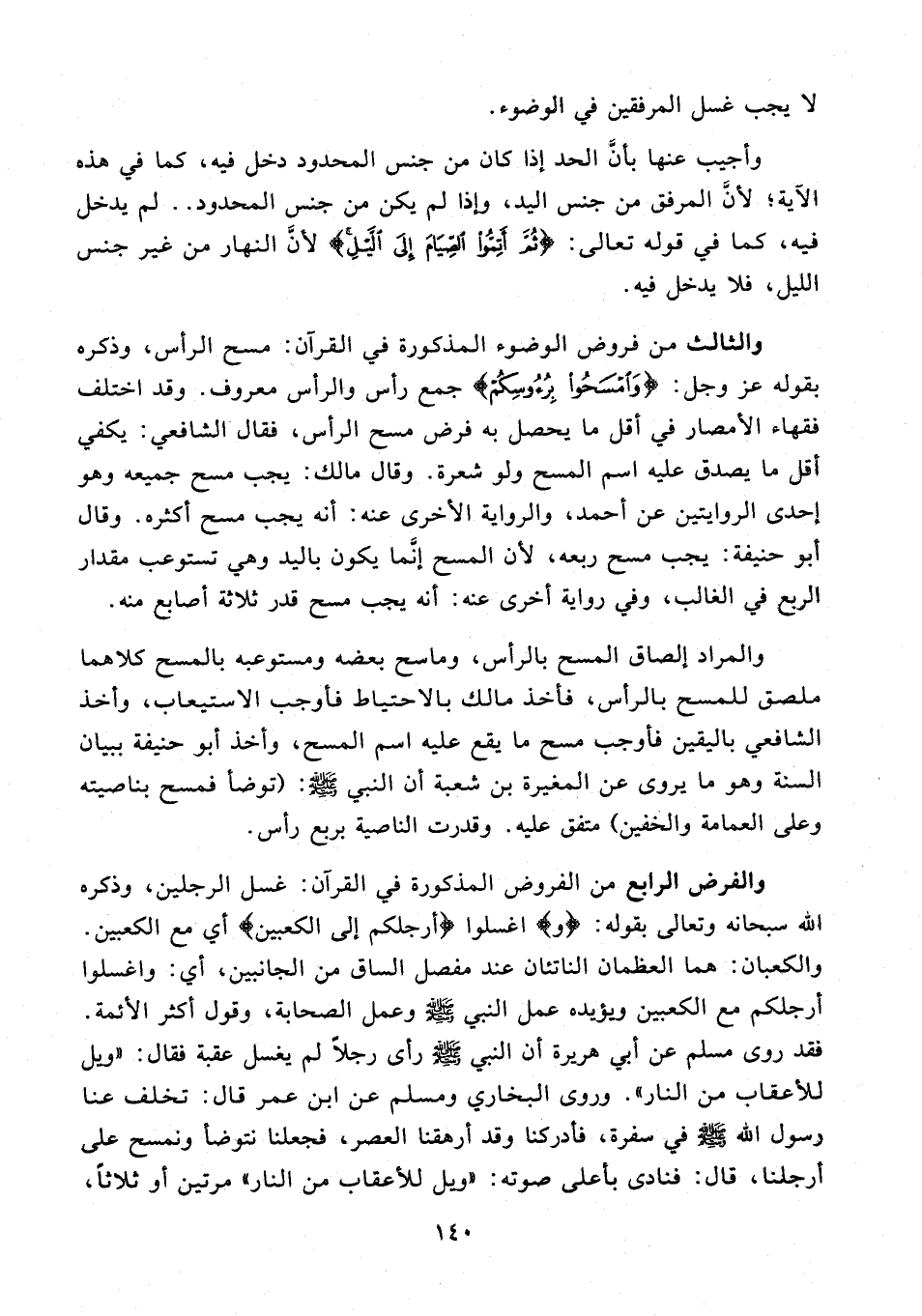 والفرض الرابع من الفروض المذكورة في القرآن: غسل الرجلين، وذكره الله سبحانه وتعالى بقوله: {و} اغسلوا {أرجلكم إلى الكعبين} أي مع الكعبين. والكعبان: ها العظمان الناتئان عند مفصل الساق من الجانبين، أي: واغسلوا أرجلكم مع الكعبين ويؤيده عمل النبي - صلى الله عليه وسلم - وعمل الصحابة، وقول أكثر الأئمة. قد روى مسلم عن أبي هريرة أن النبي - صلى الله عليه وسلم - رأى رجلًا لم يغسل عقبة فقال: "ويل للأعقاب من النار". وروى البخاري ومسلم عن ابن عمر قال: تخلف عنا رسول الله - صلى الله عليه وسلم - في سفرة، فأدركنا وقد أرهقنا العصر، فجعلنا نتوضأ ونمسح على أرجلنا، قال: فنادى بأعلى صوته: "ويل للأعقاب من النار" مرتين أو ثلاثًا،