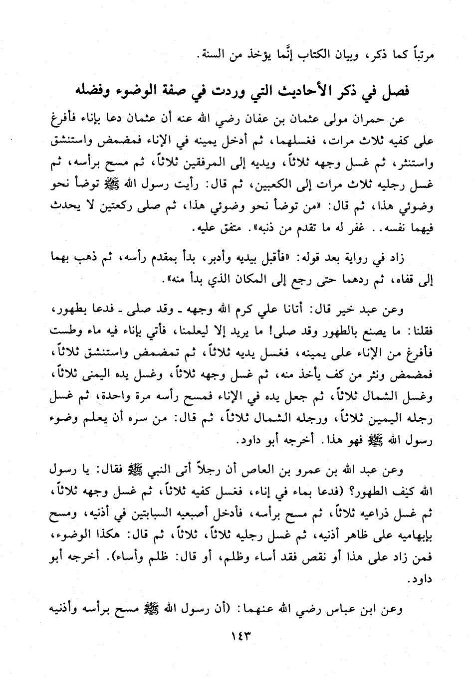 فصل في ذكر الأحاديث التي وردت في صفة الوضوء وفضله عن حمران مولى عثمان بن عفان رضي الله عنه أن عثمان دعا بإناء فأفرغ على كفيه ثلاث مرات، فغسلهما، ثم أدخل يمينه في الإناء فمضمض واستنشق واستنثر، ثم غسل وجهه ثلاثًا، ويديه إلى المرفقين ثلاثًا، ثم مسح برأسه، ثم غسل رجليه ثلاث مرات إلى الكعبين، ثم قال: رأيت رسول الله - صلى الله عليه وسلم - توضأ نحو وضوئي هذا، ثم قال: "من توضأ نحو وضوئي هذا، ثم صلى ركعتين لا يحدث فيهما نفسه .. غفر له ما تقدم من ذنبه". متفق عليه.