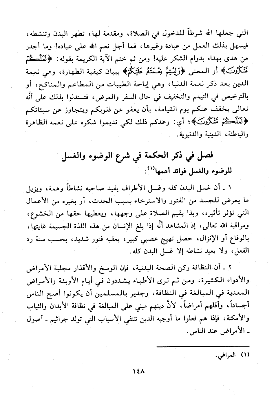 2 - أن النظافة ركن الصحة البدنية، فإن الوسخ والأقذار مجلبة الأمراض والأدواء الكثيرة، ومن ثم ترى الأطباء يشددون في أيام الأوبئة والأمراض المعدية في المبالغة في النظافة، وجدير بالمسلمين أن يكونوا أصح الناس أجسادًا؛ وأقلهم أمراضًا؛ لأنَّ دينهم مبني على المبالغة في نظافة الأبدان والثياب والأمكنة، فإذا هم فعلوا ما أوجبه الدين تنتفي الأسباب التي تولد جراثيم - أصول - الأمراض عند الناس.