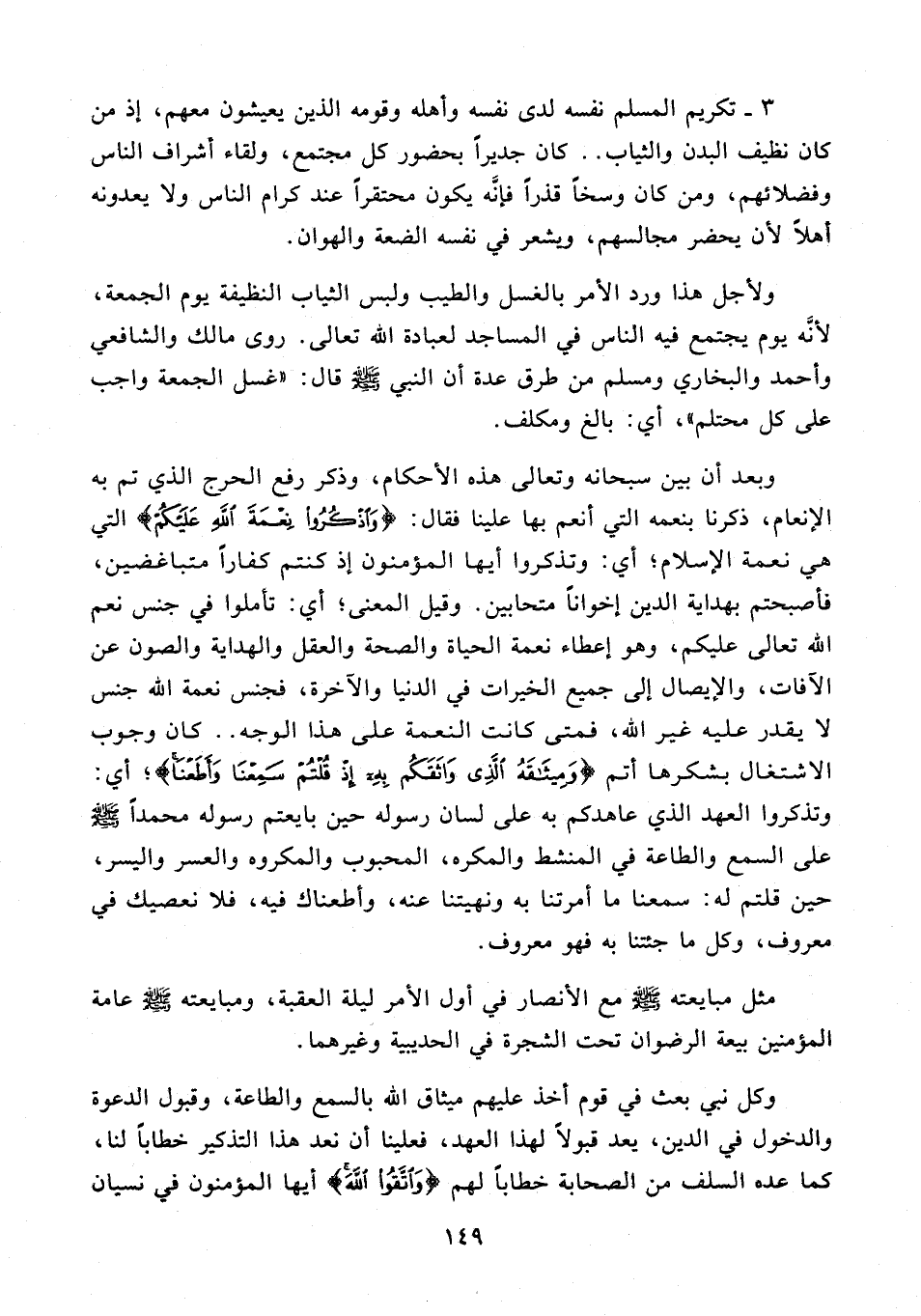 ولأجل هذا ورد الأمر بالغسل والطيب ولبس الثياب النظيفة يوم الجمعة، لأنّه يوم يجتمع فيه الناس في المساجد لعبادة الله تعالى. روى مالك والشافعي وأحمد والبخارى ومسلم من طرق عدة أن النبي - صلى الله عليه وسلم - قال: "غسل الجمعة واجب على كل محتلم"، أي: بالغ ومكلف.