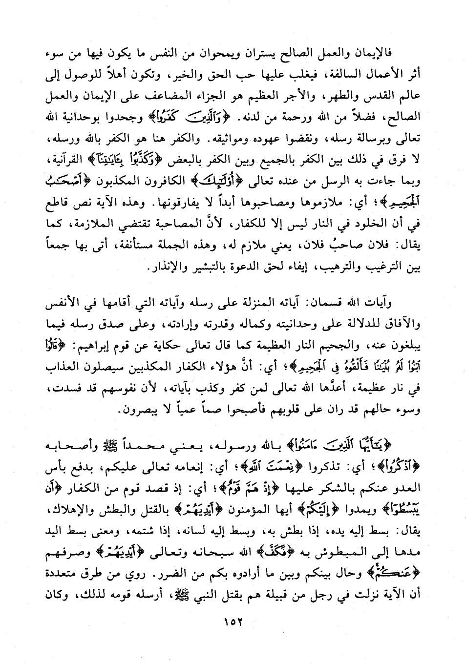 11 - {يَا أَيُّهَا الَّذِينَ آمَنُوا} بالله ورسوله، يعني محمدًا - صلى الله عليه وسلم - وأصحابه {اذْكُرُوا}؛ أي: تذكروا {نِعْمَتَ اللَّهِ}؛ أي: إنعامه تعالى عليكم، بدفع بأس العدو عنكم بالشكر عليها {إِذْ هَمَّ قَوْمٌ}؛ أي: إذ قصد قوم من الكفار {أَنْ يَبْسُطُوا} ويمدوا {إِلَيْكُمْ} أيها المؤمنون {يْدِيَهُمْ} بالقتل والبطش والإهلاك، يقال: بسط إليه يده، إذا بطش به، وبسط إليه لسانه، إذا شتمه، ومعنى بسط اليد مدها إلى المبطوش به {فَكَفَّ} الله سبحانه وتعالى {أَيْدِيَهُمْ} وصرفهم {عَنْكُمْ} وحال بينكم وبين ما أرادوه بكم من الضرر. روي من طرق متعددة أن الآية نزلت في رجل من قبيلة هم بقتل النبي - صلى الله عليه وسلم -، أرسله قومه لذلك، وكان