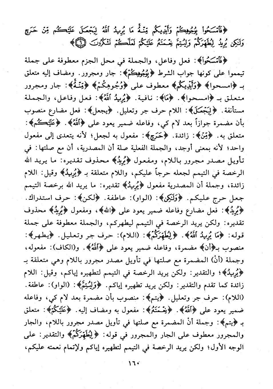 {فَامْسَحُوا}: فعل وفاعل، والجملة في محل الجزم معطوفة على جملة تيمموا على كونها جواب الشرط {بِوُجُوهِكُمْ}: جار ومجرور. ومضاف إليه متعلق بـ {امسحوا} {وَأَيْدِيكُمْ} معطوف على {وُجُوهِكُمْ} {مِنْهُ}: جار ومجرور متعلق بـ {امسحوا}. {مَا}: نافية. {يُرِيدُ اللَّهُ}: فعل وفاعل، والجملة مستأنفة. {لِيَجْعَلَ}: اللام حرف جر وتعليل. {يجعل}: فعل مضارع منصوب بأن مضمرة جوازًا بعد لام كي، وفاعله ضمير يعود على {الله}. {عليكم}: متعلق به. {مِنْ}: زائدة. {حَرَجٍ}: مفعول به لجعل؛ لأنه يتعدى إلى مفعول واحد؛ لأنه بمعنى أوجد، والجملة الفعلية صلة أن المصدرية، أن مع صلتها: في تأويل مصدر مجرور باللام، ومفعول {يُرِيدُ} محذوف تقديره: ما يريد الله الرخصة في التيمم لجعله حرجًا عليكم، واللام متعلقة بـ {يُرِيدُ} وقيل: اللام زائدة، وجملة أن المصدرية مفعول {يُرِيدُ} تقديره: ما يريد الله برخصة التيمم جعل حرج عليكم. {وَلَكِنْ}: (الواو): عاطفة. {لكن}: حرف استدراك. {يُرِيدُ}: فعل مضارع وفاعله ضمير يعود على {الله}، ومفعول {يُرِيدُ} محذوف تقديره: ولكن يريد الرخصة في التيمم ليطهركم، والجملة معطوفة على جملة قوله: {مَا يُرِيدُ اللَّهُ}. {لِيُطَهِّرَكُمْ}: (اللام): حرف جر وتعليل. {يطهر}: منصوب بـ {أنْ} مضمرة، وفاعله ضمير يعود على {الله}. و {الكاف}: مفعوله، وجملة (أنْ) المضمرة مع صلتها في تأويل مصدر مجرور باللام وهي متعلقة بـ {يُرِيدُ}؛ والتقدير: ولكن يريد الرخصة في التيمم لتطهيره إياكم، وقيل: اللام زائدة كما تقدم والتقدير: ولكن يريد تطهيره إياكم. {وَلِيُتِمَّ}: (الواو): عاطفة. (اللام): حرف جر وتعليل. {يتم}: منصوب بأن مضمرة بعد لام كي، وفاعله ضمير يعود على {اللَّهُ}. {نِعْمَتَهُ}: مفعول به ومضاف إليه. {عَلَيْكُمْ}: متعلق بـ {يتم}: وجملة أنْ المضمرة مع صلتها في تأويل مصدر مجرور باللام، والجار والمجرور معطوف على الجار والمجرور في قوله: {لِيُطَهِّرَكُمْ} والتقدير: على الوجه الأول؛ ولكن يريد الرخصة في التيمم لتطهيره إياكم ولإتمام نعمته عليكم،