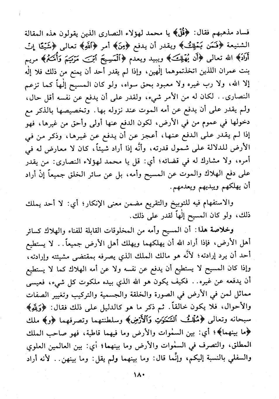 وخلاصة هذا: أن المسيح وأمه من المخلوقات القابلة للفناء والهلاك كسائر أهل الأرض، فإذا أراد الله أن يهلكهما ويهلك أهل الأرض جميعًا. لا يستطيع أحد أن يرد إرادته؛ لأنّه هو مالك الملك الذي يصرفه بمقتضى مشيئته وإرادته، وإذا كان المسيح لا يستطيع أن يدفع عن نفسه ولا عن أمه الهلاك كما لا يستطيع أن يدفعه عن غيره .. فكيف يكون هو الله الذي بيده ملكوت كل شيء، فعيسى مماثل لمن في الأرض في الصورة والخلقة والجسمية والتركيب وتغيير الصفات والأحوال، فلا يكون خالقًا. ثم ذكر ما هو كالدليل على ذلك فقال: {وَلِلَّهِ} سبحانه وتعالى {مُلْكُ السَّمَاوَاتِ وَالْأَرْضِ} وسلطنتهما وتصرفهما {و} ملك {ما بينهما}؛ أي: بين السموات والأرض وما فيهما قاطبة، فهو صاحب الملك المطلق، والتصرف في السموات والأرض وما بينهما؛ أي: بين العالمين العلوي والسفلي بالنسبة إليكم، وإنَّما قال: وما بينهما ولم يقل: وما بينهن .. لأنه أراد