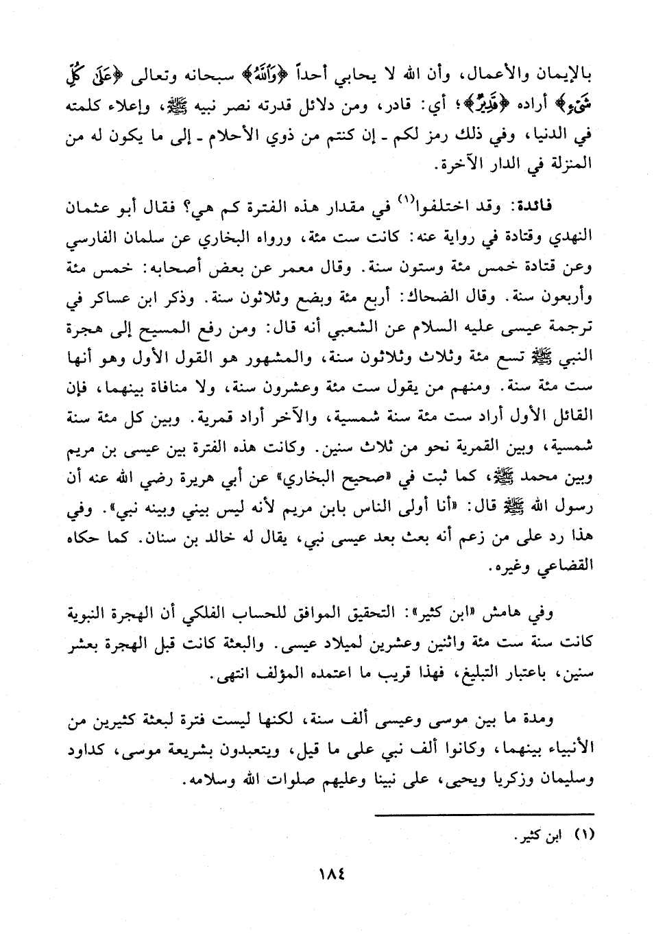 فائدة: وقد اختلفوا (¬1) في مقدار هذه الفترة كم هي؟ فقال أبو عثمان النهدي وقتادة في رواية عنه: كانت ست مئة، ورواه البخاري عن سلمان الفارسي وعن قتادة خمس مئة وستون سنة. وقال معمر عن بعض أصحابه: خمس مئة وأربعون سنة. وقال الضحاك: أربع مئة وبضع وثلاثون سنة. وذكر ابن عساكر في ترجمة عيسى عليه السلام عن الشعبي أنه قال: ومن رفع المسيح إلى هجرة النبي - صلى الله عليه وسلم - تسع مئة وثلاث وثلاثون سنة، والمشهور هو القول الأول وهو أنها ست مئة سنة. ومنهم عن يقول ست مئة وعشرون سنة، ولا منافاة بينهما، فإن القائل الأول أراد ست مئة سنة شمسية، والآخر أراد قمرية. وبين كل مئة سنة شمسية، وبين القمرية نحو من ثلاث سنين. وكانت هذه الفترة بين عيسى بن مريم وبين محمَّد - صلى الله عليه وسلم -، كما ثبت في "صحيح البخاري" عن أبي هريرة رضي الله عنه أن رسول الله - صلى الله عليه وسلم - قال: "أنا أولى الناس بابن مريم لأنه ليس بيني وبينه نبي". وفي هذا رد على من زعم أنه بعث بعد عيسى نبي، يقال له خالد بن سنان. كما حكاه القضاعي وغيره.