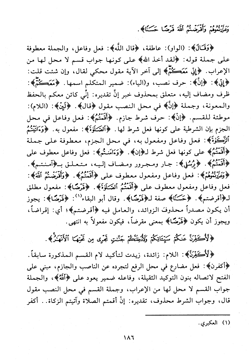 {وَقَالَ}: (الواو): عاطفة، {قال الله}: فعل وفاعل، والجملة معطوفة على جملة قوله: {لقد أخذ الله} على كونها جواب قسم لا محل لها من الإعراب. {إِنِّي مَعَكُمْ} إلى آخر الآية مقول محكي لقال، وإن شئت قلت: {إِنِّي}: {إِنِّ}: حرف نصب، و (الياء): ضمير المتكلم اسمها. {مَعَكُمْ}: ظرف ومضاف إليه، متعلق بمحذوف خبر إن تقديره: إني كائن معكم بالحفظ والمعونة، وجملة {إنَّ} في محل النصب مقول {قال}. {لَئِنْ}: (اللام): موطئة للقسم. {إنْ}: حرف شرط جازم. {أَقَمْتُمُ}: فعل وفاعل في محل الجزم بإن الشرطية على كونها فعل شرط لها. {الصَّلَاةَ}: مفعول به. {وَآتَيْتُمُ الزَّكَاةَ}: فعل وفاعل ومفعول به، في محل الجزم، معطوفة على جملة {أَقَمْتُمُ} على كونها فعل شرط لـ {إن}. {وَآمَنْتُمْ}: فعل وفاعل معطوف على {أَقَمْتُمُ}. {بِرُسُلِي}: جار ومجرور ومضاف إليه، متعلق بـ {آمنتم}. {وَعَزَّرْتُمُوهُمْ}: فعل وفاعل ومفعول معطوف على {أَقَمْتُمُ}. {وَأَقْرَضْتُمُ اللَّهَ}: فعل وفاعل ومفعول معطوف على {أَقَمْتُمُ الصَّلَاةَ}. {قَرْضًا}: مفعول مطلق لـ {أقرضتم}. {حَسَنًا} صفة لـ {قَرْضًا}. وقال أبو البقاء (¬1): {قَرْضًا}: يجوز أن يكون مصدرًا محذوفَ الزوائد، والعامل فيه {أقرضتم}؛ أي: إقراضًا، ويجوز أن يكون {قَرْضًا} بمعنى مقرضًا، فيكون مفعولًا به انتهى.