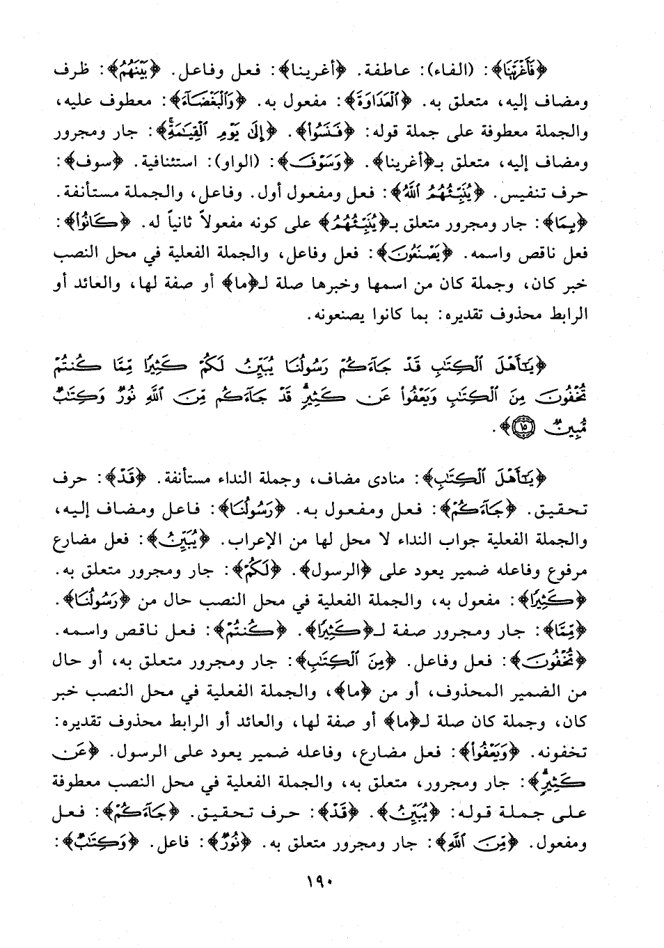 {يَا أَهْلَ الْكِتَابِ}: منادى مضاف، وجملة النداء مستأنفة. {قَدْ}: حرف تحقيق. {جَاءَكُمْ}: فعل ومفعول به. {رَسُولُنَا}: فاعل ومضاف إليه، والجملة الفعلية جواب النداء لا محل لها من الإعراب. {يُبَيِّنُ}: فعل مضارع مرفوع وفاعله ضمير يعود على {الرسول}. {لَكُمْ}: جار ومجرور متعلق به. {كَثِيرًا}: مفعول به، والجملة الفعلية في محل النصب حال من {رَسُولُنَا}. {مِمَّا}: جار ومجرور صفة لـ {كَثِيرًا}. {كُنْتُمْ}: فعل ناقص واسمه. {تُخْفُونَ}: فعل وفاعل. {مِنَ الْكِتَابِ}: جار ومجرور متعلق به، أو حال من الضمير المحذوف، أو من {ما}، والجملة الفعلية في محل النصب خبر كان، وجملة كان صلة لـ {ما} أو صفة لها، والعائد أو الرابط محذوف تقديره: تخفونه. {وَيَعْفُو}: فعل مضارع، وفاعله ضمير يعود على الرسول. {عَنْ كَثِيرٍ}: جار ومجرور، متعلق به، والجملة الفعلية في محل النصب معطوفة على جملة قوله: {يُبَيِّنُ}. {قَدْ}: حرف تحقيق. {جَاءَكُمْ}: فعل ومفعول. {مِنَ اللَّهِ}: جار ومجرور متعلق به. {نُورٌ}: فاعل. {وَكِتَابٌ}:
