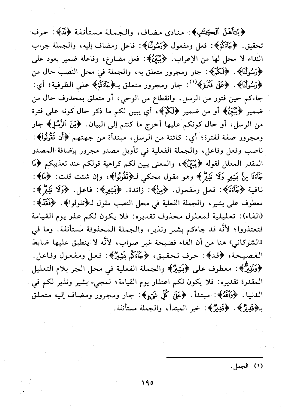{يَا أَهْلَ الكتاب}: منادى مضاف، والجملة مستأنفة {قَدْ}: حرف تحقيق. {جَاءَكُمْ}: فعل ومفعول {رَسُولُنَا}: فاعل ومضاف إليه، والجملة جواب النداء لا محل لها من الإعراب. {يُبَيِّنُ}: فعل مضارع، وفاعله ضمير يعود على {رَسُولُنَا}. {لَكُمْ}: جار ومجرور متعلق به، والجملة في محل النصب حال من {رَسُولُنَا}. {عَلَى فَتْرَةٍ} (¬1): جار ومجرور متعلق بـ {جَاءَكُمْ} على الظرفية؛ أي: جاءكم حين فتور من الرسل، وانقطاع من الوحي، أو متعلق بمحذوف حال من ضمير {يُبَيِّنُ} أو من ضمير {لَكُمْ}، أي يبين لكم ما ذكر حال كونه على فترة من الرسل، أو حال كونكم عليها أحوج ما كنتم إلى البيان. {مِنَ الرُّسُلِ} جار ومجرور صفة لفترة؛ أي: كائنة من الرسل، مبتدأة من جهتهم {أَنْ تَقُولُوا}: ناصب وفعل وفاعل، والجملة الفعلية في تأويل مصدر مجرور بإضافة المصدر المقدر المعلل لقوله {يُبَيِّنُ}، والمعنى يبين لكم كراهية قولكم عند تعذيبكم {مَا جَاءَنَا مِنْ بَشِيرٍ وَلَا نَذِيرٍ} وهو مقول محكي لـ {تَقُولُوا}، وإن شئت قلت: {مَا}: نافية {جَاءَنَا}: فعل ومفعول. {مِنْ}: زائدة. {بَشِيرٍ}: فاعل. {وَلَا نَذِير}: معطوف على بشير، والجملة الفعلية في محل النصب مقول لـ {تقولوا}. {فَقَدْ}: (الفاء): تعليلية لمعلول محذوف تقديره: فلا يكون لكم عذر يوم القيامة فتعتذروا؛ لأنَّه قد جاءكم بشير ونذير، والجملة المحذوفة مستأنفة. وما في "الشوكاني" هنا من أن الفاء فصيحة غير صواب، لأنَّه لا ينطبق عليها ضابط الفصيحة، {قد}: حرف تحقيق، {جَاءَكُمْ بَشِيرٌ}: فعل ومفعول وفاعل. {وَنَذِيرٌ}: معطوف على {بَشِيرٌ} والجملة الفعلية في محل الجر بلام التعليل المقدرة تقديره: فلا يكون لكم اعتذار يوم القيامة؛ لمجيء بشير ونذير لكم في الدنيا. {وَاللَّهُ}: مبتدأ. {عَلَى كُلِّ شَيْءٍ}: جار ومجرور ومضاف إليه متعلق بـ {قَدِيرٌ}. {قَدِيرٌ}: خبر المبتدأ، والجملة مستأنفة.
