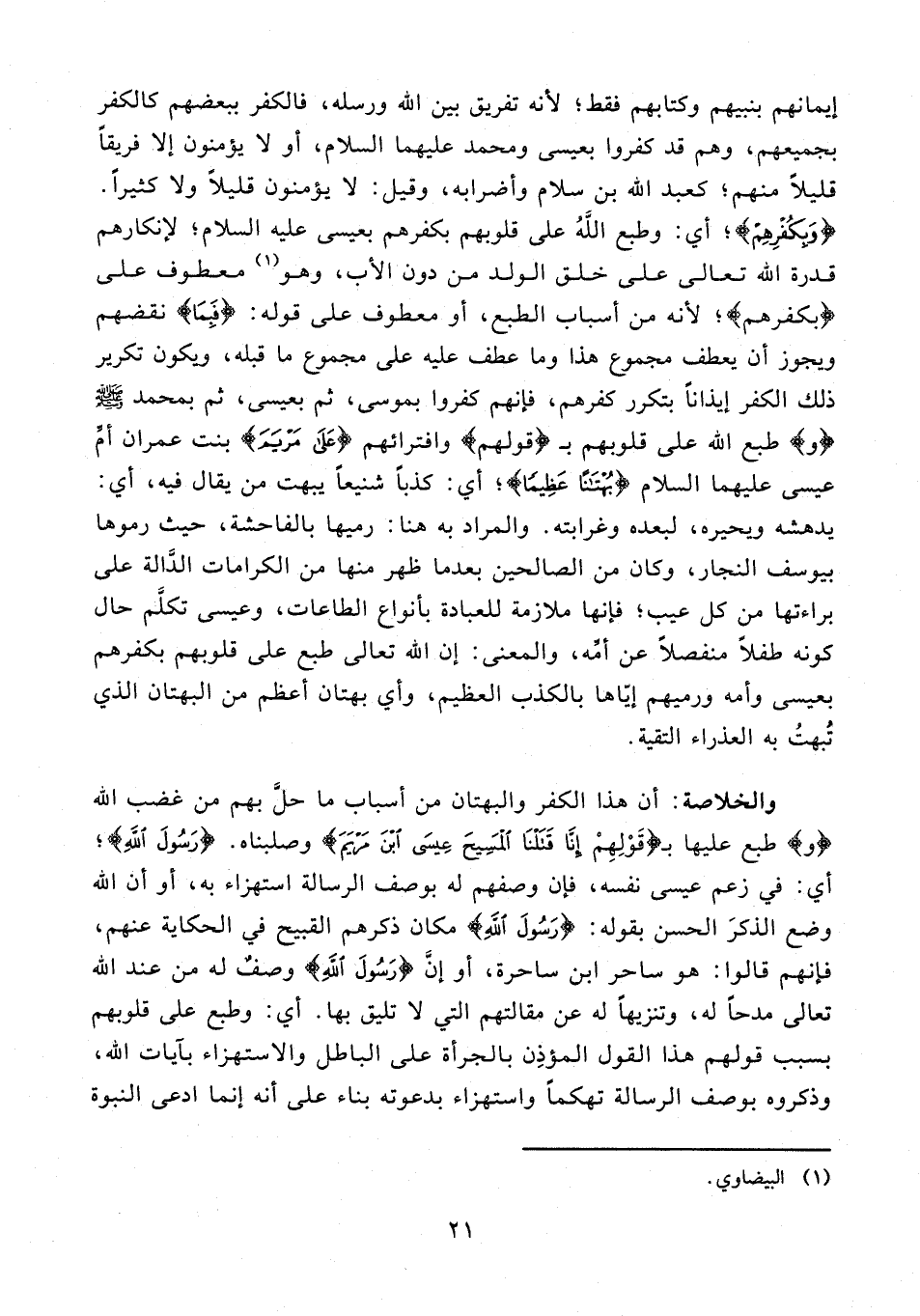 157 - والخلاصة: أن هذا الكفر والبهتان من أسباب ما حل بهم من غضب الله {و} طبع عليها بـ {قَوْلِهِمْ إِنَّا قَتَلْنَا الْمَسِيحَ عِيسَى ابْنَ مَرْيَمَ} وصلبناه. {رَسُولَ اللَّهِ}؛ أي: في زعم عيسى نفسه، فإن وصفهم له بوصف الرسالة استهزاء به، أو أن الله وضع الذكرَ الحسن بقوله: {رَسُولَ اللَّهِ} مكان ذكرهم القبيح في الحكاية عنهم، فإنهم قالوا: هو ساحر ابن ساحرة، أو إنَّ {رَسُولَ اللَّهِ} وصفٌ له من عند الله تعالى مدحًا له، وتنزيهًا له عن مقالتهم التي لا تليق بها. أي: وطبع على قلوبهم بسبب قولهم هذا القول المؤذِن بالجرأة على الباطل والاستهزاء بآيات الله، وذكروه بوصف الرسالة تهكمًا واستهزاء بدعوته بناء على أنه إنما ادعى النبوة
