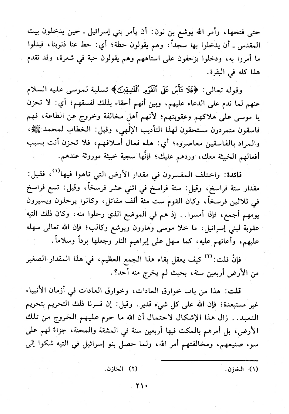 قلت: هذا من باب خوارق العادات، وخوارق العادات في أزمان الأنبياء غير مستبعدة؛ فإن الله على كل شيء قدير. وقيل: إن فسرنا ذلك التحريم بتحريم التعبد .. زال هذا الإشكال لاحتمال أن الله ما حرم عليهم الخروج من تلك الأرض، بل أمرهم بالمكث فيها أربعين سنة في المشقة والمحنة، جزاءً لهم على سوء صنيعهم، ومخالفتهم أمر الله، ولما حصل بنو إسرائيل في التيه شكوا إلى