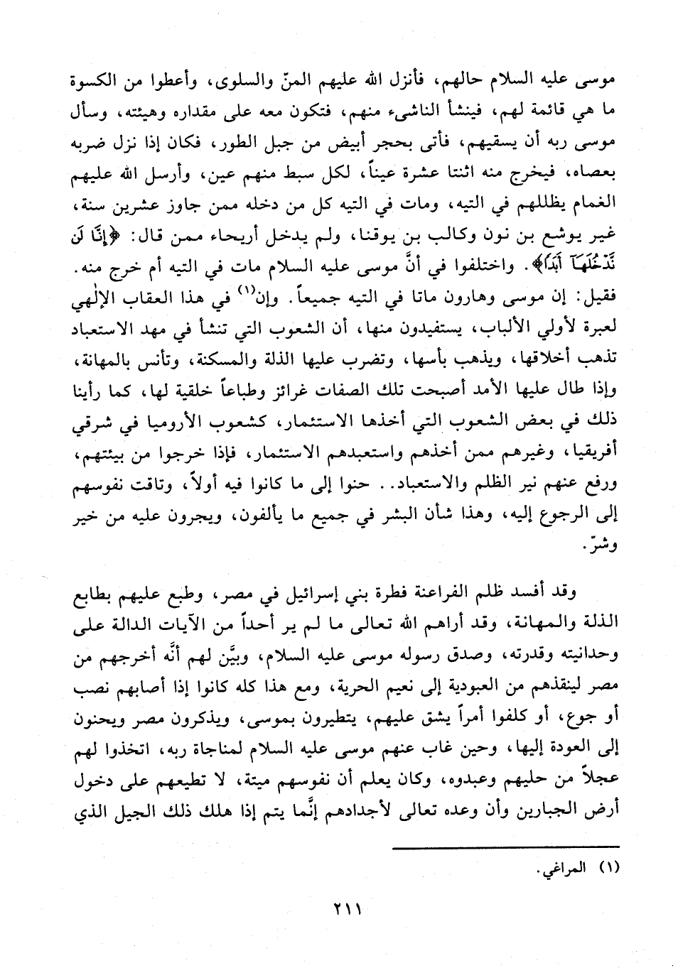 موسى عليه السلام حالهم، فأنزل الله عليهم المنّ والسلوى، وأعطوا من الكسوة ما هي قائمة لهم، فينشأ الناشىء منهم، فتكون معه على مقداره وهيئته، وسأل موسى ربه أن يسقيهم، فأتى بحجر أبيض من جبل الطور، فكان إذا نزل ضربه بعصاه، فيخرج منه اثنتا عشرة عينًا، لكل سبط منهم عين، وأرسل الله عليهم الغمام يظللهم في التيه، ومات في التيه كل من دخله ممن جاوز عشرين سنة، غير يوشع بن نون وكالب بن يوقنا، ولم يدخل أريحاء ممن قال: {إِنَّا لَنْ نَدْخُلَهَا أَبَدًا}. واختلفوا في أنَّ موسى عليه السلام مات في التيه أم خرج منه. فقيل: إن موسى وهارون ماتا في التيه جميعًا. وإن (¬1) في هذا العقاب الإلهي لعبرة لأولي الألباب، يستفيدون منها، أن الشعوب التي تنشأ في مهد الاستعباد تذهب أخلاقها، ويذهب بأسها، وتضرب عليها الذلة والمسكنة، وتأنس بالمهانة، وإذا طال عليها الأمد أصبحت تلك الصفات غرائز وطباعًا خلقية لها، كما رأينا ذلك في بعض الشعوب التي أخذها الاستئمار، كشعوب الأروميا في شرقي أفريقيا، وغيرهم ممن أخذهم واستعبدهم الاستئمار، فإذا خرجوا من بيئتهم، ورفع عنهم نير الظلم والاستعباد .. حنوا إلى ما كانوا فيه أولًا، وتاقت نفوسهم إلى الرجوع إليه، وهذا شأن البشر في جميع ما يألفون، ويجرون عليه من خير وشرّ.