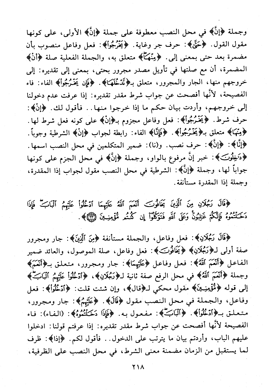 {قَالَ رَجُلَانِ}: فعل وفاعل، والجملة مستأنفة {مِنَ الَّذِينَ}: جار ومجرور صفة أولى لـ {رَجُلَانِ} {يَخَافُونَ}: فعل وفاعل، صلة الموصول، والعائد ضمير الفاعل {أَنْعَمَ اللَّهُ}: فعل وفاعل {عَلَيْهِمَا}: جار ومجرور، متعلق بـ {أَنْعَمَ} وجملة {أَنْعَمَ اللَّهُ} في محل الرفع صفة ثانية لـ {رَجُلَانِ}، {ادْخُلُوا عَلَيْهِمُ الْبَابَ} إلى قوله {مُؤْمِنِينَ} مقول محكي لـ {قال}، وإن شئت قلت: {ادْخُلُوا}: فعل وفاعل، والجملة في محل النصب مقول {قَالَ}. {عَلَيْهِمُ}: جار ومجرور، متعلق بـ {ادْخُلُوا}. {الْبَابَ}: مفعول به. {فَإِذَا دَخَلْتُمُوهُ}: (الفاء): فاء الفصيحة لأنَّها أفصحت عن جواب شرط مقدر تقديره: إذا عرفتم قولنا: ادخلوا عليهم الباب، وأردتم بيان ما يترتب على الدخول .. فأقول لكم. {إذا}: ظرف لما يستقبل من الزمان مضمنة معنى الشرط، في محل النصب على الظرفية،