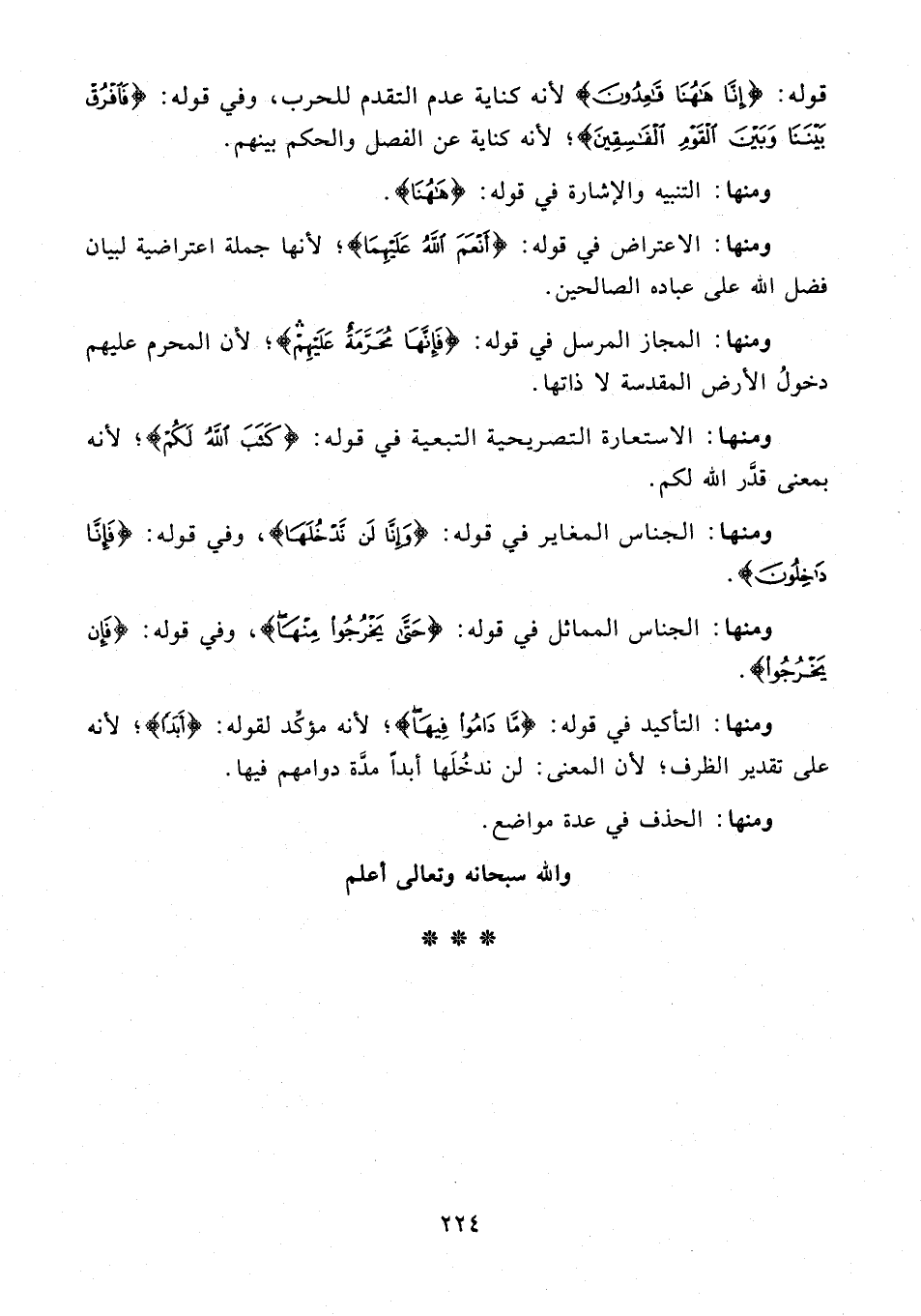 قوله: {إِنَّا هَاهُنَا قَاعِدُونَ} لأنه كناية عدم التقدم للحرب، وفي قوله: {فَافْرُقْ بَيْنَنَا وَبَيْنَ الْقَوْمِ الْفَاسِقِينَ}؛ لأنه كناية عن الفصل والحكم بينهم.