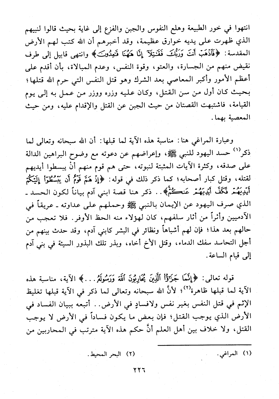 قوله تعالى: {إِنَّمَا جَزَاءُ الَّذِينَ يُحَارِبُونَ اللَّهَ وَرَسُولَهُ ...} الآية، مناسبة هذه الآية لما قبلها ظاهرة (¬2)؛ لأنَّ الله سبحانه وتعالى لما ذكر في الآية قبلها تغليظ الإثم في قتل النفس بغير نفس ولا فسادٍ في الأرض .. أتبعه ببيان الفساد في الأرض الذي يوجب القتل؛ فإن بعض ما يكون فسادًا في الأرض لا يوجب القتل، ولا خلاف بين أهل العلم أنَّ حكم هذه الآية مترتب في المحاربين من