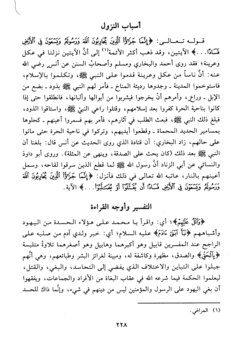 قوله تعالى: {إِنَّمَا جَزَاءُ الَّذِينَ يُحَارِبُونَ اللَّهَ وَرَسُولَهُ وَيَسْعَوْنَ فِي الْأَرْضِ فَسَادًا ...} الآيتين، وقد ذهب أكثر الأئمة (¬1) إلى أنَّ الآيتين نزلتا في عكل وعرينة؛ فقد روى أحمد والبخاري ومسلم وأصحابُ السنن عن أنسٍ رضي الله عنه: أنَّ ناسًا من عكل وعرينة قدموا على النبي - صلى الله عليه وسلم -، وتكلموا بالإِسلام، فاستوخموا المدينة - وجدوها رديئة المناخ - فأمر لهم النبي - صلى الله عليه وسلم - بذود - بضع من الإبل - وراعٍ، وأمرهم أنْ يخرجوا فيشربوا من أبوالها وألبانها، فانطلقوا حتى إذا كانوا بناحية الحرة كفروا بعد إسلامهم، وقتلوا راعي النبيّ - صلى الله عليه وسلم -، واستاقوا الذود، فبلغ ذلك النبي - صلى الله عليه وسلم -، فبعث الطلب في آثارهم، فأمر بهم فسمروا أعينهم - كحلوها بمسامير الحديد المحماة - وقطعوا أيديهم، وتركوا في ناحية الحرة حتى ماتوا على حالهم، زاد البخاري: أن قتادة الذي روى الحديث عن أنس نقال: بلغنا أن النبي - صلى الله عليه وسلم - بعد ذلك (كان يحث على الصدقة، وينهى عن المثلة). وروى أبو داودَ والنسائي عن أبي الزناد أنَّ رسول الله - صلى الله عليه وسلم - لما قطع الذين سرقوا لقاحه، وسمل أعينهم بالنار، عاتبه الله تعالى في ذلك فأنزل: {إِنَّمَا جَزَاءُ الَّذِينَ يُحَارِبُونَ اللَّهَ وَرَسُولَهُ وَيَسْعَوْنَ فِي الْأَرْضِ فَسَادًا أَنْ يُقَتَّلُوا أَوْ يُصَلَّبُوا ...} الآية.