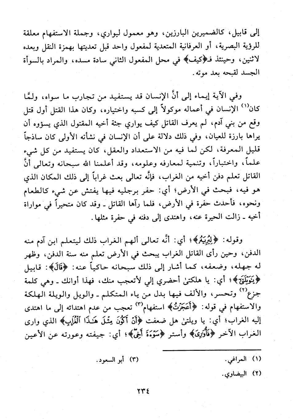 وفي الآية إيماء إلى أنَّ الإنسان قد يستفيد من تجارب ما سواه، ولمَّا كان (¬1) الإنسان في أعماله موكولًا إلى كسبه واختياره، وكان هذا القتل أول قتل وقع من بني آدم، لم يعرف القاتل كيف يواري جثة أخيه المقتول الذي يسؤوه أن يراها بارزة للعيان، وفي ذلك دلالة على أن الإنسان في نشأته الأولى كان ساذجًا قليل المعرفة، لكن لما فيه من الاستعداد والعقل، كان يستفيد من كل شيء علمًا، واختبارًا، وتنمية لمعارفه وعلومه، وقد أعلمنا الله سبحانه وتعالى أنَّ القاتل تعلم دفن أخيه من الغراب، فإنَّه تعالى بعث غرابًا إلى ذلك المكان الذي هو فيه، فبحث في الأرض؛ أي: حفر برجليه فيها يفتش عن شيء كالطعام ونحوه، فأحدث حفرة في الأرض، فلما رآها القاتل - وقد كان متحيرًا في مواراة أخيه - زالت الحيرة عنه، واهتدى إلى دفنه في حفرة مثلها.