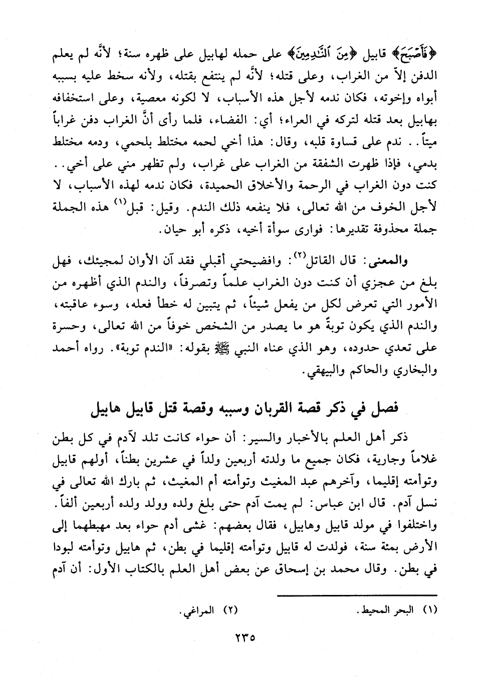 فصل في ذكر قصة القربان وسببه وقصة قتل قابيل هابيل