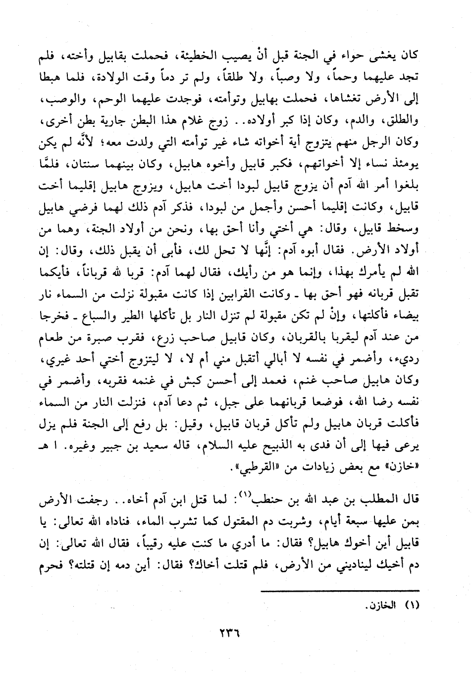 قال المطلب بن عبد الله بن حنطب (¬1): لما قتل ابن آدم أخاه .. رجفت الأرض بمن عليها سبعة أيام، وشربت دم المقتول كما تشرب الماء، فناداه الله تعالى: يا قابيل أين أخوك هابيل؟ فقال: ما أدري ما كنت عليه رقيبًا، فقال الله تعالى: إن دم أخيك ليناديني من الأرض، فلم قتلت أخاك؟ فقال: أين دمه إن قتلته؟ فحرم