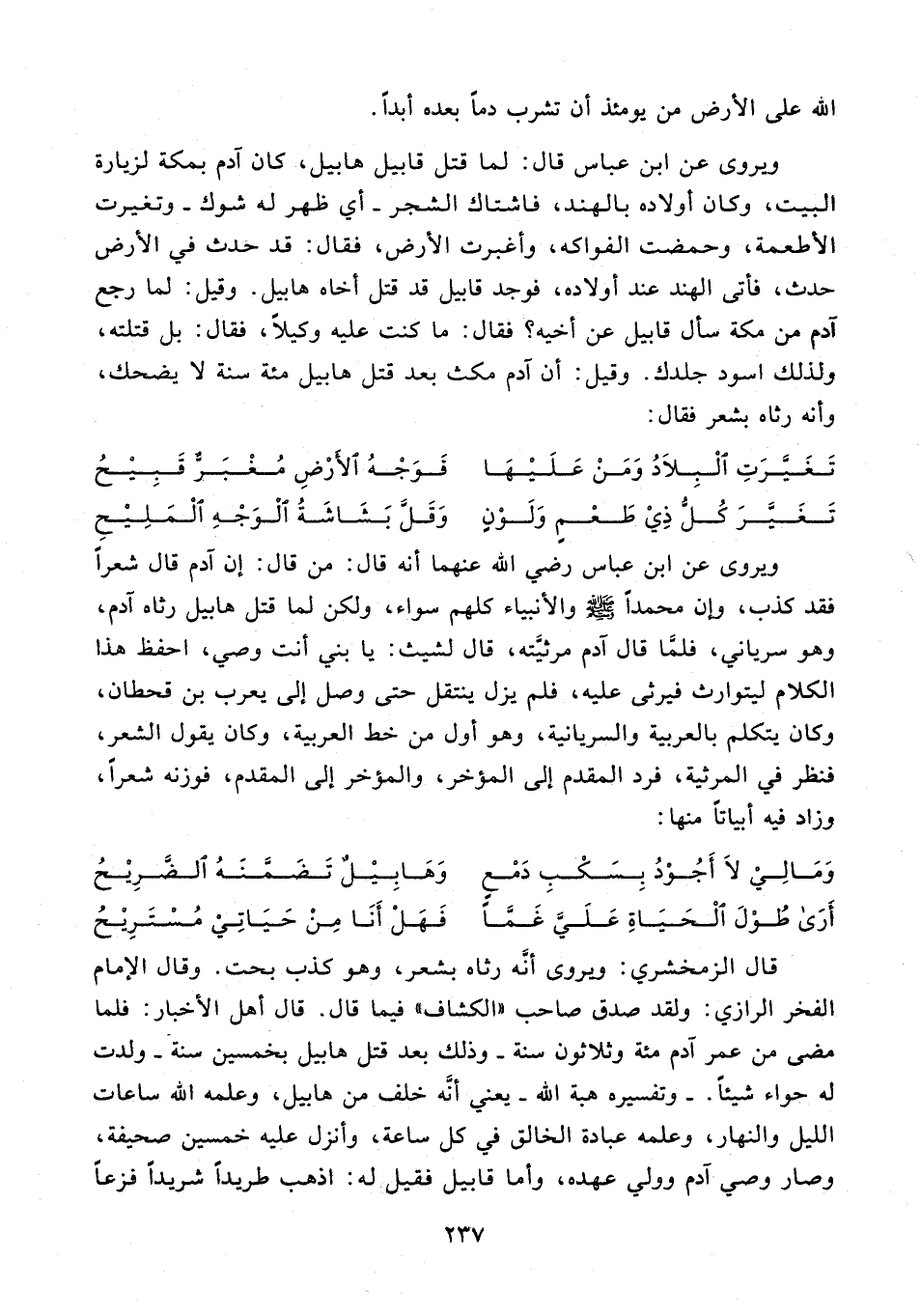 قال الزمخشري: ويروى أنَّه رثاه بشعر، وهو كذب بحت. وقال الإِمام الفخر الرازي: ولقد صدق صاحب "الكشاف" فيما قال. قال أهل الأخبار: فلما مضى من عمر آدم مئة وثلاثون سنة - وذلك بعد قتل هابيل بخمسين سنة - ولدت له حواء شيئًا - وتفسيره هبة الله - يعني أنَّه خلف عن هابيل، وعلمه الله ساعات الليل والنهار، وعلمه عبادة الخالق في كل ساعة، وأنزل عليه خمسين صحيفة، وصار وصي آدم وولي عهده، وأما قابيل فقيل له: اذهب طريدًا شريدًا فزعًا