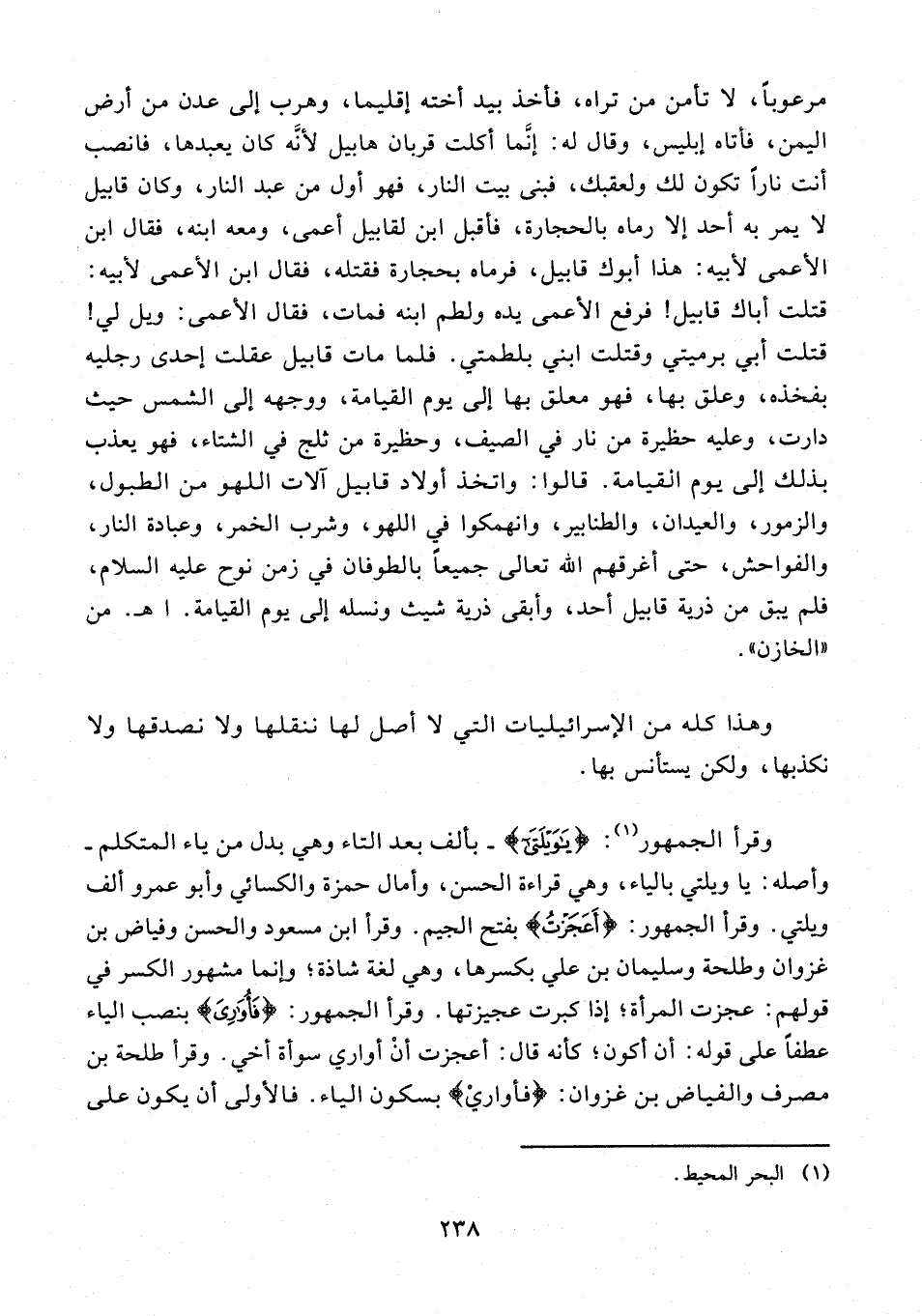 مرعوبًا، لا تأمن من تراه، فأخذ بيد أخته إقليما، وهرب إلى عدن من أرض اليمن، فأتاه إبليس، وقال له: إنَّما أكلت قربان هابيل لأنَّه كان يعبدها، فانصب أنت نارًا تكون لك ولعقبك، فبنى بيت النار، فهو أول من عبد النار، وكان قابيل لا يمر به أحد إلا رماه بالحجارة، فأقبل ابن لقابيل أعمى، ومعه ابنه، فقال ابن الأعمى لأبيه: هذا أبوك قابيل، فرماه بحجارة فقتله، فقال ابن الأعمى لأبيه: قتلت أباك قابيل! فرفع الأعمى يده ولطم ابنه فمات، فقال الأعمى: ويل لي قتلت أبي برميتي وقتلت ابني بلطمتي. فلما مات قابيل عقلت إحدى رجليه بفخذه، وعلق بها، فهو معلق بها إلى يوم القيامة، ووجهه إلى الشمس حيث دارت، وعليه حظيرة من نار في الصيف، وحظيرة من ثلج في الشتاء، فهو يعذب بذلك إلى يوم القيامة. قالوا: واتخذ أولاد قابيل آلات اللهو من الطبول، والزمور، والعيدان، والطنابير، وانهمكوا في اللهو، وشرب الخمر، وعبادة النار، والفواحش، حتى أغرقهم الله تعالى جميعًا بالطوفان في زمن نوح عليه السلام، فلم يبق من ذرية قابيل أحد، وأبقى ذرية شيث ونسله إلى يوم القيامة. اهـ. من "الخازن".
