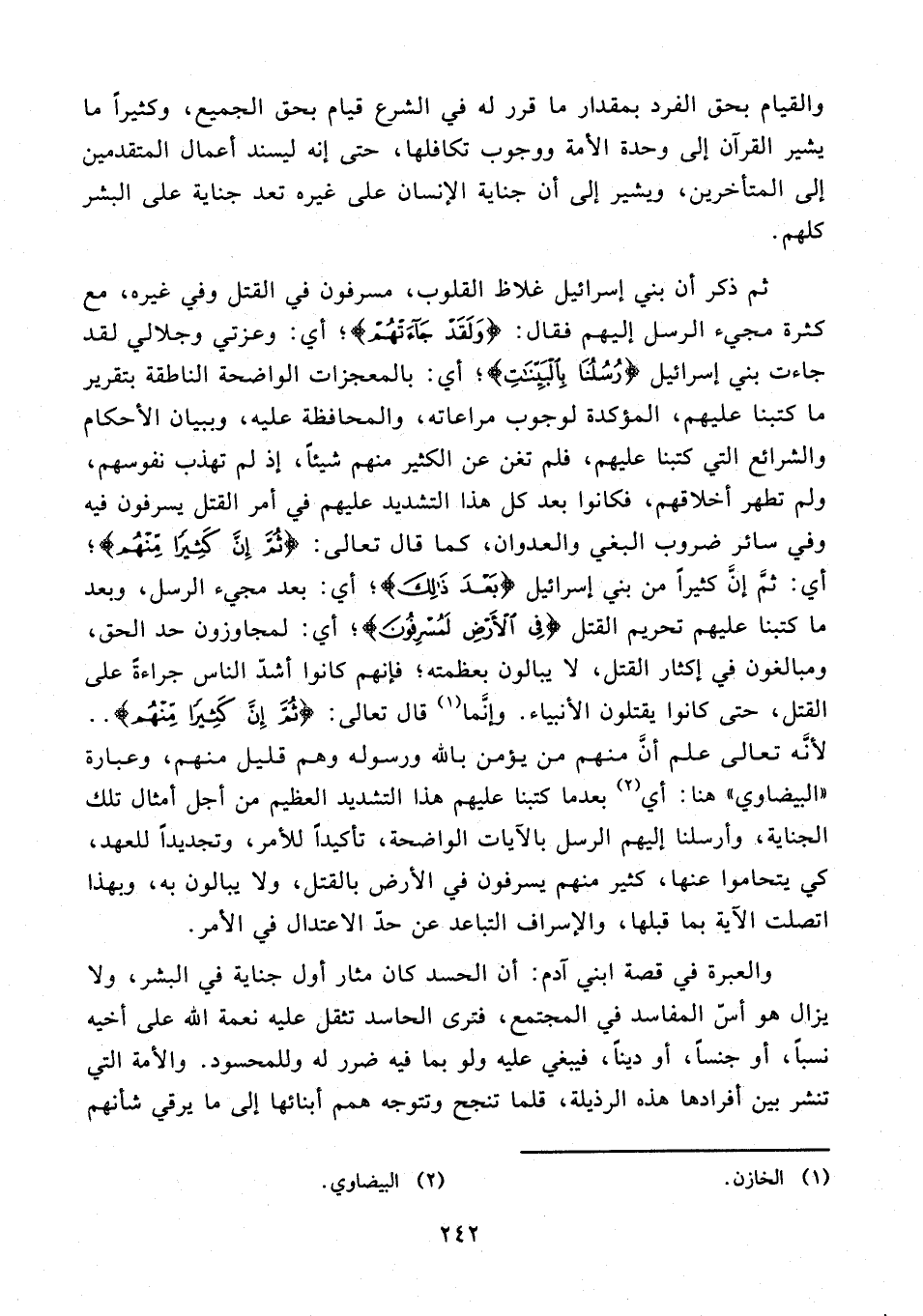 والقيام بحق الفرد بمقدار ما قرر له في الشرع قيام بحق الجميع، وكثيرًا ما يشير القرآن إلى وحدة الأمة ووجوب تكافلها، حتى إنه ليسند أعمال المتقدمين إلى المتأخرين، ويشير إلى أن جناية الإنسان على غيره تعد جناية على البشر كلهم.