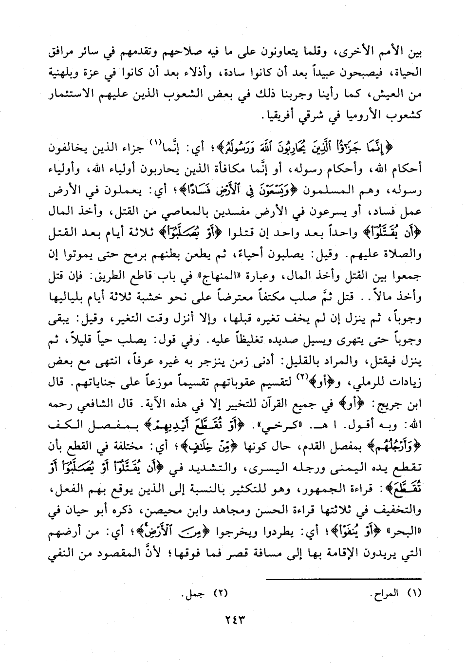 33 - {إِنَّمَا جَزَاءُ الَّذِينَ يُحَارِبُونَ اللَّهَ وَرَسُولَهُ}؛ أي: إنَّما (¬1) جزاء الذين يخالفون أحكام الله، وأحكام رسوله، أو إنَّما مكافأة الذين يحاربون أولياء الله، وأولياء رسوله، وهم المسلمون {وَيَسْعَوْنَ فِي الْأَرْضِ فَسَادًا}؛ أي: يعملون في الأرض عمل فساد، أو يسرعون في الأرض مفسدين بالمعاصي من القتل، وأخذ المال {أَنْ يُقَتَّلُوا} واحدًا بعد واحد إن قتلوا {أَوْ يُصَلَّبُوا} ثلاثة أيام بعد القتل والصلاة عليهم. وقيل: يصلبون أحياءً، ثم يطعن بطنهم برمح حتى يموتوا إن جمعوا بين القتل وأخذ المال، وعبارة "المنهاج" في باب قاطع الطريق: فإن قتل وأخذ مالًا .. قتل ثمَّ صلب مكتفًا معترضًا على نحو خشبة ثلاثة أيام بلياليها وجوبًا، ثم ينزل إن لم يخف تغيره قبلها، وإلا أنزل وقت التغير، وقيل: يبقى وجوبًا حتى يتهرى ويسيل صديده تغليظًا عليه. وفي قول: يصلب حيًّا قليلًا، ثم ينزل فيقتل، والمراد بالقليل: أدنى زمن ينزجر به غيره عرفًا، انتهى مع بعض زيادات للرملي، و {أو} (¬2) لتقسيم عقوباتهم تقسيمًا موزعًا على جناياتهم. قال ابن جريج: {أو} في جميع القرآن للتخيير إلا في هذه الآية. قال الشافعي رحمه الله: وبه أقول. اهـ. "كرخي". {أَوْ تُقَطَّعَ أَيْدِيهِمْ} بمفصل الكف {وَأَرْجُلُهُمْ} بمفصل القدم، حال كونها {مِنْ خِلَافٍ}؛ أي: مختلفة في القطع بأن تقطع يده اليمنى ورجله اليسرى، والتشديد في {أَنْ يُقَتَّلُوا أَوْ يُصَلَّبُوا أَوْ تُقَطَّعَ}: قراءة الجمهور، وهو للتكثير بالنسبة إلى الذين يوقع بهم الفعل، والتخفيف في ثلاثتها قراءة الحسن ومجاهد وابن محيصن، ذكره أبو حيان في "البحر" {أَوْ يُنْفَوْا}؛ أي: يطردوا ويخرجوا {مِنَ الْأَرْضِ}؛ أي: من أرضهم التي يريدون الإقامة بها إلى مسافة قصر فما فوقها؛ لأنَّ المقصود من النفي