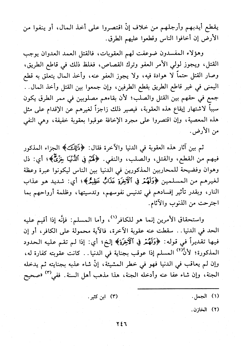 وهؤلاء المفسدون ضوعفت لهم العقوبات، فالقتل العمد العدوان يوجب القتل، ويجوز لولي الأمر العفو وترك القصاص، فغلظ ذلك في قاطع الطريق، وصار القتل حتمًا لا هوادة فيه، ولا يجوز العفو عنه، وأخذ المال يتعلق به قطع اليمنى في غير قاطع الطريق بقطع الطرفين، وإن جمعوا بين القتل وأخذ المال .. جمع في حقهم بين القتل والصلب؛ لأن بقاءهم مصلوبين في ممر الطرق يكون سببًا لاشتهار إيقاع هذه العقوبة، فيصير ذلك زاجزًا لغيرهم عن الإقدام على مثل هذه المعصية، وإن اقتصروا على مجرد الإخافة عوقبوا بعقوبة خفيفة، وهي النفي من الأرض.