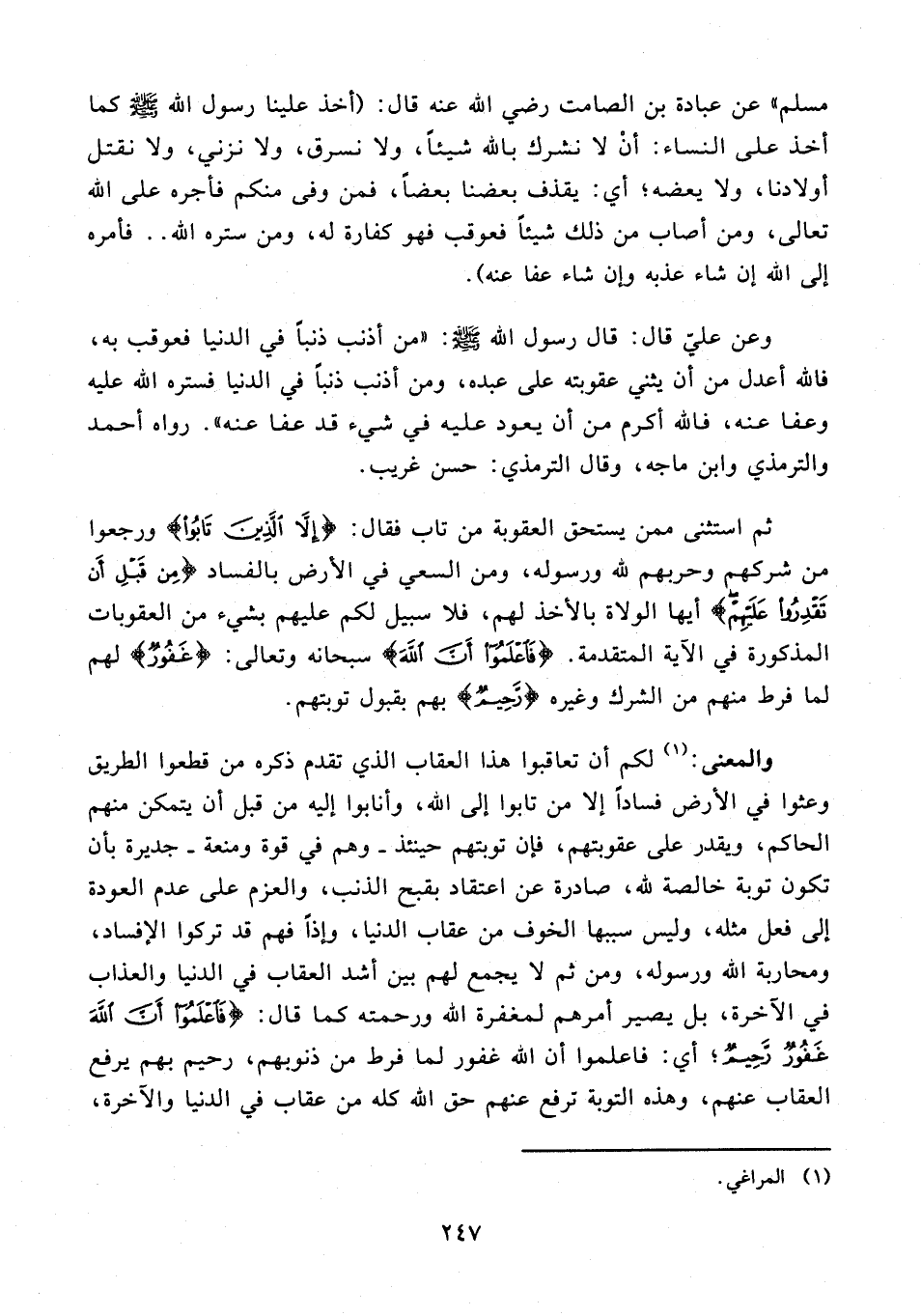 والمعنى: (¬1) لكم أن تعاقبوا هذا العقاب الذي تقدم ذكره من قطعوا الطريق وعثوا في الأرض فسادًا إلا من تابوا إلى الله، وأنابوا إليه من قبل أن يتمكن منهم الحاكم، ويقدر على عقوبتهم، فإن توبتهم حينئذ - وهم في قوة ومنعة - جديرة بأن تكون توبة خالصة لله، صادرة عن اعتقاد بقبح الذنب، والعزم على عدم العودة إلى فعل مثله، وليس سببها الخوف من عقاب الدنيا، وإذًا فهم قد تركوا الإفساد، ومحاربة الله ورسوله، ومن ثم لا يجمع لهم بين أشد العقاب في الدنيا والعذاب في الآخرة، بل يصير أمرهم لمغفرة الله ورحمته كما قال: {فَاعْلَمُوا أَنَّ اللَّهَ غَفُورٌ رَحِيمٌ}؛ أي: فاعلموا أن الله غفور لما فرط من ذنوبهم، رحيم بهم يرفع العقاب عنهم، وهذه التوبة ترفع عنهم حق الله كله من عقاب في الدنيا والآخرة،