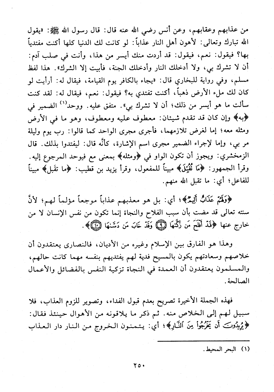 وهذا هو الفارق بين الإِسلام وغيره من الأديان، فالنصارى يعتقدون أن خلاصهم وسعادتهم يكون بالمسيح فدية لهم يفتديهم بنفسه مهما كانت حالهم، والمسلمون يعتقدون أن العمدة في النجاة تزكية النفس بالفضائل والأعمال الصالحة.