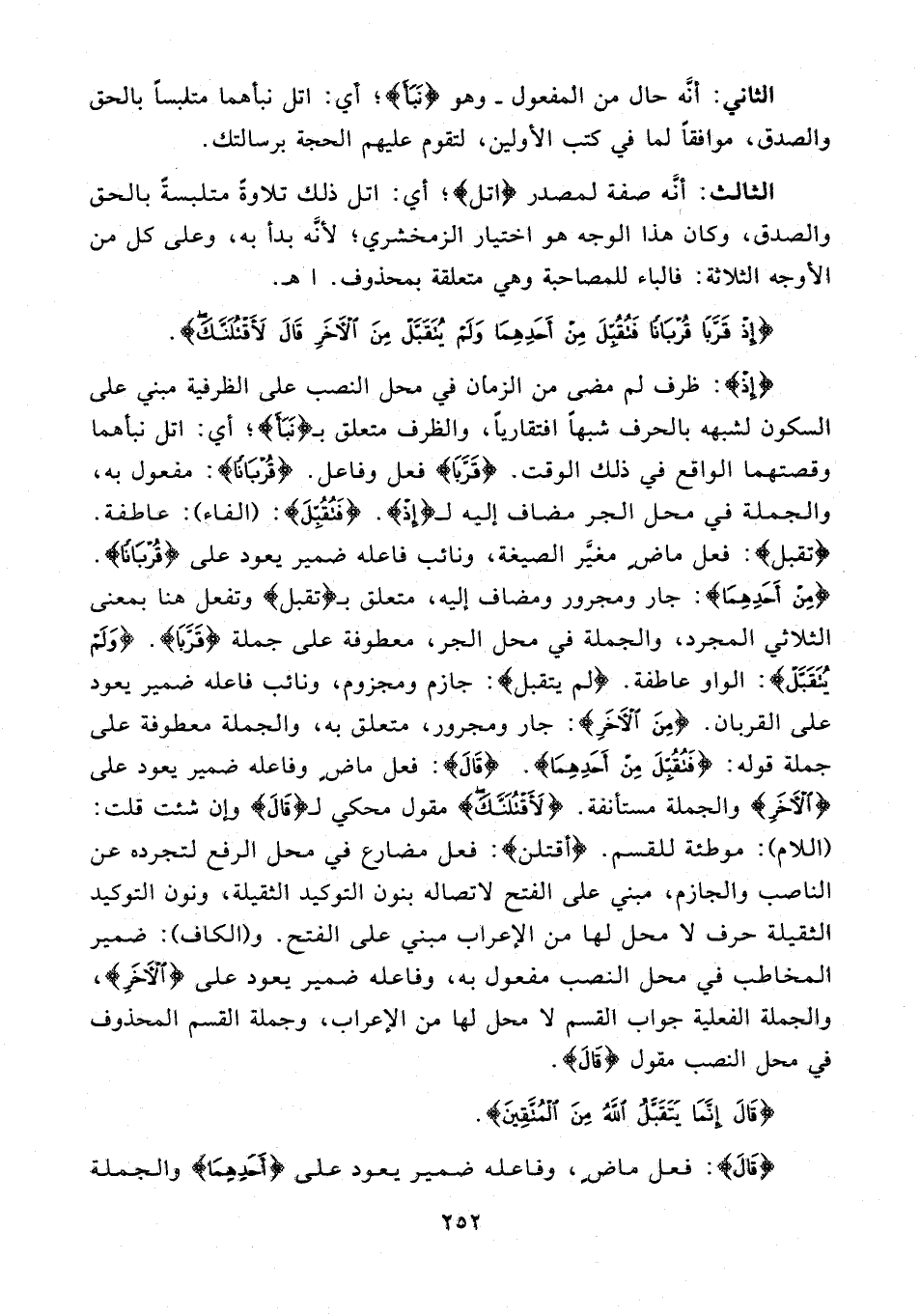 {إِذْ}: ظرف لم مضى من الزمان في محل النصب على الظرفية مبني على السكون لشبهه بالحرف شبهًا افتقاريًّا، والظرف متعلق بـ {نَبَأَ}؛ أي اتل نبأهما وقصتهما الواقع في ذلك الوقت. {قَرَّبَا} فعل وفاعل. {قُرْبَانًا}: مفعول به، والجملة في محل الجر مضاف إليه لـ {إِذْ}. {فتقبل}: {الفاء}): عاطفة. {تقبل}: فعل ماضٍ مغيَّر الصيغة، ونائب فاعله ضمير يعود على {قُرْبَانًا}. {مِنْ أَحَدِهِمَا}: جار ومجرور ومضاف إليه، متعلق بـ {تقبل} وتفعل هنا بمعنى الثلاثي المجرد، والجملة في محل الجر، معطوفة على جملة {قَرَّبَا}. {وَلَمْ يُتَقَبَّلْ}: الواو عاطفة. {لم يتقبل}: جازم ومجزوم، ونائب فاعله ضمير يعود على القربان. {مِنَ الْآخَرِ}: جار ومجرور، متعلق به، والجملة معطوفة على جملة قوله: {فَتُقُبِّلَ مِنْ أَحَدِهِمَا}. {قَالَ}: فعل ماضٍ وفاعله ضمير يعود على {الْآخَرِ} والجملة مستأنفة. {لَأَقْتُلَنَّكَ} مقول محكي لـ {قَالَ} وإن شئت قلت: (اللام): موطئة للقسم. {أقتلن}: فعل مضارع في محل الرفع لتجرده عن الناصب والجازم، مبني على الفتح لاتصاله بنون التوكيد الثقيلة، ونون التوكيد الثقيلة حرف لا محل لها من الإعراب مبني على الفتح. و (الكاف): ضمير المخاطب في محل النصب مفعول به، وفاعله ضمير يعود على {الْآخَرِ}، والجملة الفعلية جواب القسم لا محل لها من الإعراب، وجملة القسم المحذوف في محل النصب مقول {قَالَ}.