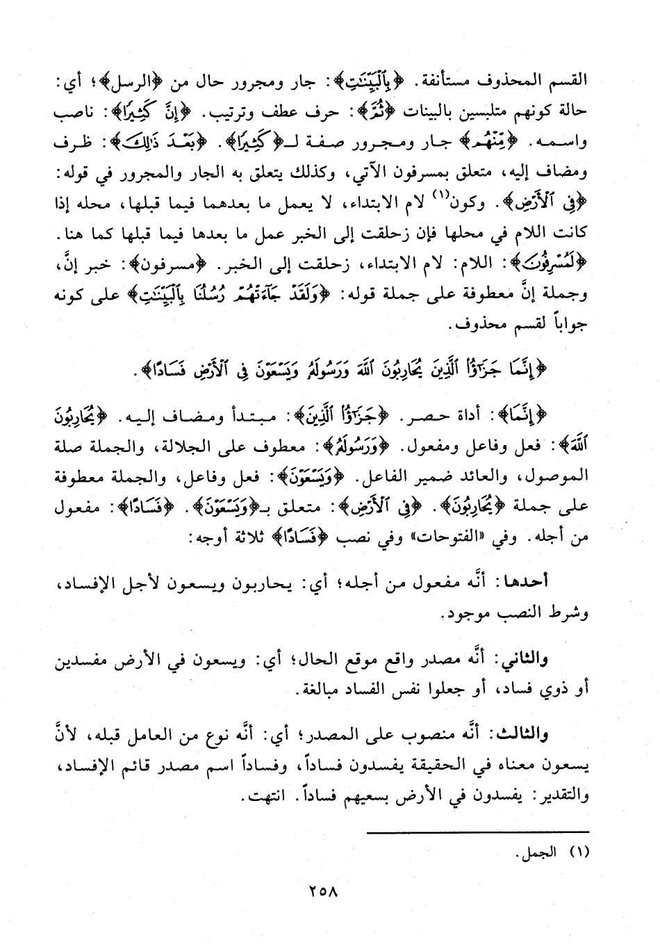 {إِنَّمَا}: أداة حصر. {جَزَاءُ الَّذِينَ}: مبتدأ ومضاف إليه. {يُحَارِبُونَ اللَّهَ}: فعل وفاعل ومفعول. {وَرَسُولَهُ}: معطوف على الجلالة، والجملة صلة الموصول، والعائد ضمير الفاعل. {وَيَسْعَوْنَ}: فعل وفاعل، والجملة معطوفة على جملة {يُحَارِبُونَ}. {فِي الْأَرْضِ}: متعلق بـ {وَيَسْعَوْنَ}. {فَسَادًا}: مفعول من أجله. وفي "الفتوحات" وفي نصب {فَسَادًا} ثلاثة أوجه: