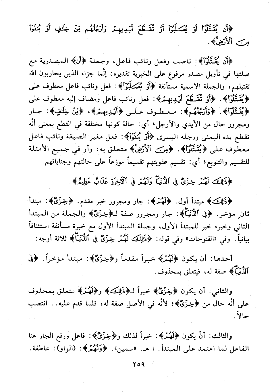 {أَنْ يُقَتَّلُوا}: ناصب وفعل ونائب فاعل، وجملة {أَن} المصدرية مع صلتها في تأويل مصدر مرفوع على الخبرية تقديره: إنَّما جزاء الذين يحاربون الله تقتيلهم، والجملة الإسمية مستأنفة {أَوْ يُصَلَّبُوا}: فعل ونائب فاعل معطوف على {يُقَتَّلُوا}. {أَوْ تُقَطَّعَ أَيْدِيهِمْ}: فعل ونائب فاعل ومضاف إليه معطوف على {يُقَتَّلُوا}. {وَأَرْجُلُهُمْ}: معطوف على {أَيْدِيهِمْ}، {مِنْ خِلَافٍ}: جار ومجرور حال من الأيدي والأرجل؛ أي: حالة كونها مختلفة في القطع بمعنى أنَّه تقطع يده اليمنى ورجله اليسرى {أَوْ يُنْفَوْا}: فعل مغير الصيغة ونائب فاعل معطوف على {يُقَتَّلُوا}. {مِنَ الْأَرْضِ} متعلق به، وأو في جميع الأمثلة للتقسيم والتنويع؛ أي: تقسيم عقوبتهم تقسيمًا موزعًا على حالتهم وجناياتهم.