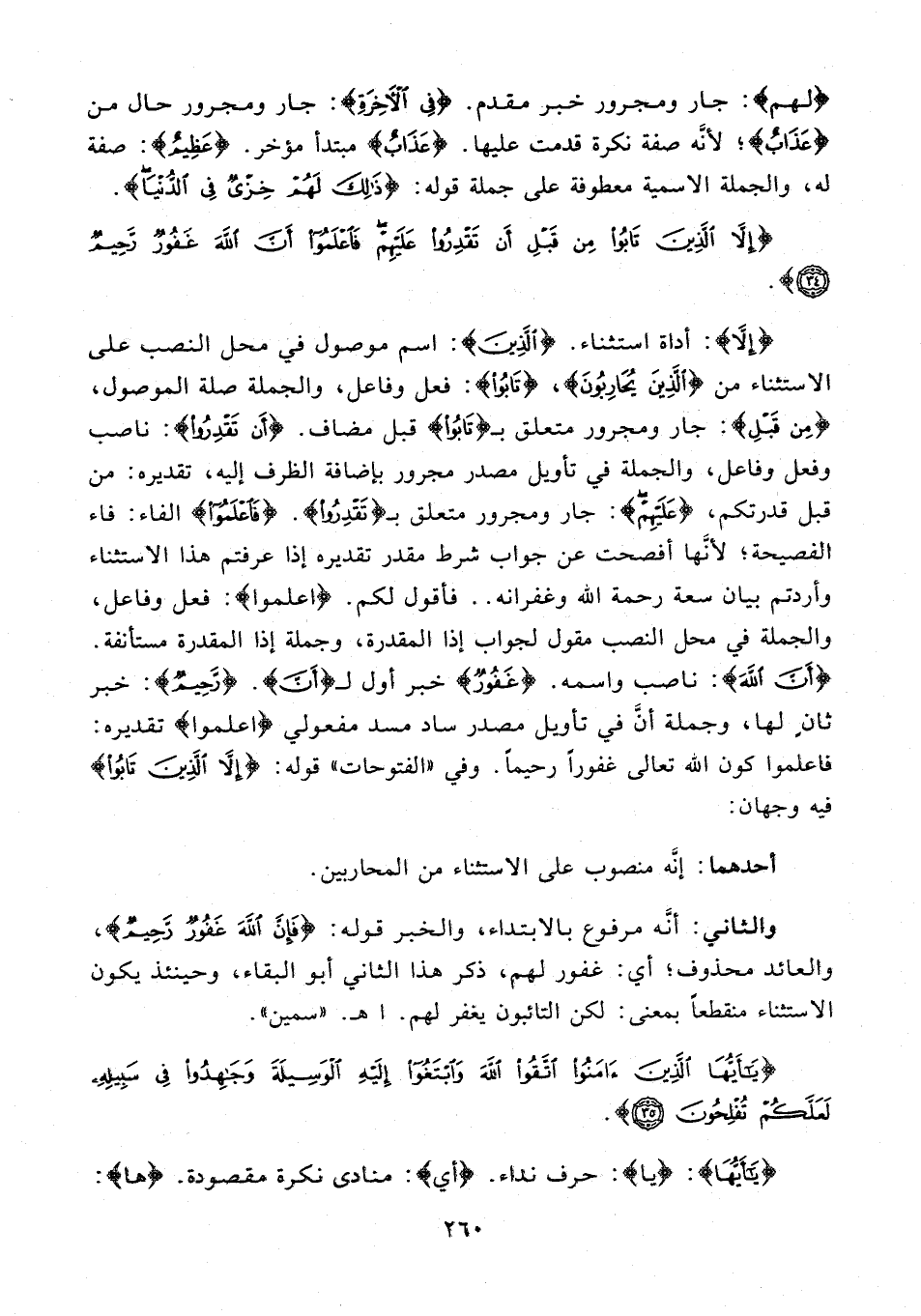 {إِلَّا}: أداة استثناء. {الَّذِينَ}: اسم موصول في محل النصب على الاستثناء من {الَّذِينَ يُحَارِبُونَ}، {تَابُوا}: فعل وفاعل، والجملة صلة الموصول، {مِنْ قَبْلِ}: جار ومجرور متعلق بـ {تَابُوا} قبل مضاف. {أَنْ تَقْدِرُوا}: ناصب وفعل وفاعل، والجملة في تأويل مصدر مجرور بإضافة الظرف إليه، تقديره: من قبل قدرتكم، {عَلَيْهِمْ}: جار ومجرور متعلق بـ {تَقْدِرُوا}. {فَاعْلَمُوا} الفاء: فاء الفصيحة؛ لأنَّها أفصح عن جواب شرط مقدر تقديره إذا عرفتم هذا الاستثناء وأردتم بيان سعة رحمة الله وغفرانه .. فأقول لكم، {اعلموا}: فعل وفاعل، والجملة في محل النصب مقول لجواب إذا المقدرة، وجملة إذًا المقدرة مستأنفة. {أَنَّ اللَّهَ}: ناصب واسمه. {غَفُورٌ} خبر أول لـ {أَنَّ}. {رَحِيمٌ}: خبر ثانٍ لها، وجملة أنَّ في تأويل مصدر ساد مسد مفعولي {اعلموا} تقديره: فاعلموا كون الله تعالى غفورًا رحيمًا. وفي "الفتوحات" قوله: {إِلَّا الَّذِينَ تَابُوا} فيه وجهان: