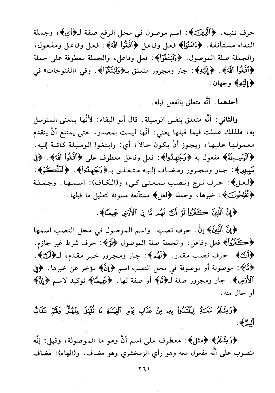 والثاني: أنَّه متعلق بنفس الوسيلة. قال أبو البقاء: لأنَّها بمعنى المتوسل به، فلذلك عملت فيما قبلها يعني: أنَّها ليست بمصدر، حتى يمتنع أنْ يتقدم معمولها عليها، ويجوز أنْ يكون حالًا؛ أي: وابتغوا الوسيلة كائنة إليه، {الْوَسِيلَةَ} مفعول به {وَجَاهِدُوا}: فعل وفاعل معطوف على {اتَّقُوا اللَّهَ}. {فِي سَبِيلِهِ}: جار ومجرور ومضاف إليه متعلق بـ {وَجَاهِدُوا}. {لَعَلَّكُمْ}: {لعل}: حرف ترج ونصب بمعنى كي، و (الكاف): اسمها. وجملة {تُفْلِحُونَ}: خبرها، وجملة {لعل} مستأنفة مسوقة لتعليل ما قبلها.