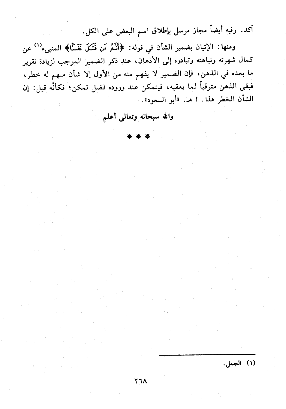 ومنها: الإتيان بضمير الشأن في قوله: {أَنَّهُ مَنْ قَتَلَ نَفْسًا} المنبىء (¬1) عن كمال شهرته ونباهته وتبادره إلى الأذهان، عند ذكر الضمير الموجب لزيادة تقرير ما بعده في الذهن، فإن الضمير لا يفهم منه من الأول إلا شأن مبهم له خطر، فبقى الذهن مترقيًا لما يعقبه، فيتمكن عند وروده فضل تمكن؛ فكأنّه قيل: إن الشأن الخطر هذا. اهـ. "أبو السعود".