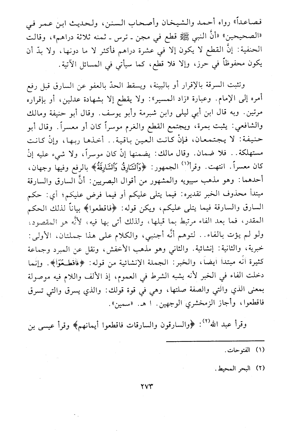 وتثبت السرقة بالإقرار أو بالبينة، ويسقط الحدّ بالعفو عن السارق قبل رفع أمره إلى الإمام. وعبارة "زاد المسير": ولا يقطع إلا بشهادة عدلين، أو بإقراره مرتين. وبه قال ابن أبي ليلى وابن شبرمة وأبو يوسف. وقال أبو حنيفة ومالك والشافعي: يثبت بمرة، ويجتمع القطع والغرم موسرًا كان أو معسرًا. وقال أبو حنيفة: لا يجتمعان، فإنْ كانت العين باقية .. أخذها ربها، وإنْ كانت مستهلكة .. فلا ضمان. وقال مالك: يضمنها إنْ كان موسرًا، ولا شيء عليه إنْ كان معسرًا. انتهت. وقرأ (¬1) الجمهور: {وَالسَّارِقُ وَالسَّارِقَةُ} بالرفع وفيها وجهان، أحدهما: وهو مذهب سيبويه والمشهور من أقوال البصريين: أنَّ السارق والسارقة مبتدأ محذوف الخبر تقديره: فيما يتلى عليكم أو فيما فرض عليكم؛ أي: حكم السارق والسارقة فيما يتلى عليكم، ويكن قوله: {فاقْطَعُوا} بيانًا لذلك الحكم المقدر، فما بعد الفاء مرتبط بما قبلها، ولذلك أتى بها فيه؛ لأنَّه هو المقصود؛ ولو لم يؤت بالفاء .. لتوهم أنَّه أجنبي، والكلام على هذا جملتان، الأولى: خبرية، والثانية: إنشائية. والثاني وهو مذهب الأخفش، ونقل عن المبرد وجماعة كثيرة أنَّه مبتدأ أيضًا، والخبر: الجملة الإنشائية من قوله: {فَاقْطَعُوا}. وإنما دخلت الفاء في الخبر لأنه يشبه الشرط في العموم، إذ الألف واللام فيه موصولة بمعنى الذي والتي والصفة صلتها، وهي في قوة قولك: والذي يسرق والتي تسرق فاقطعوا، وأجاز الزمخشري الوجهين. اهـ. "سمين".