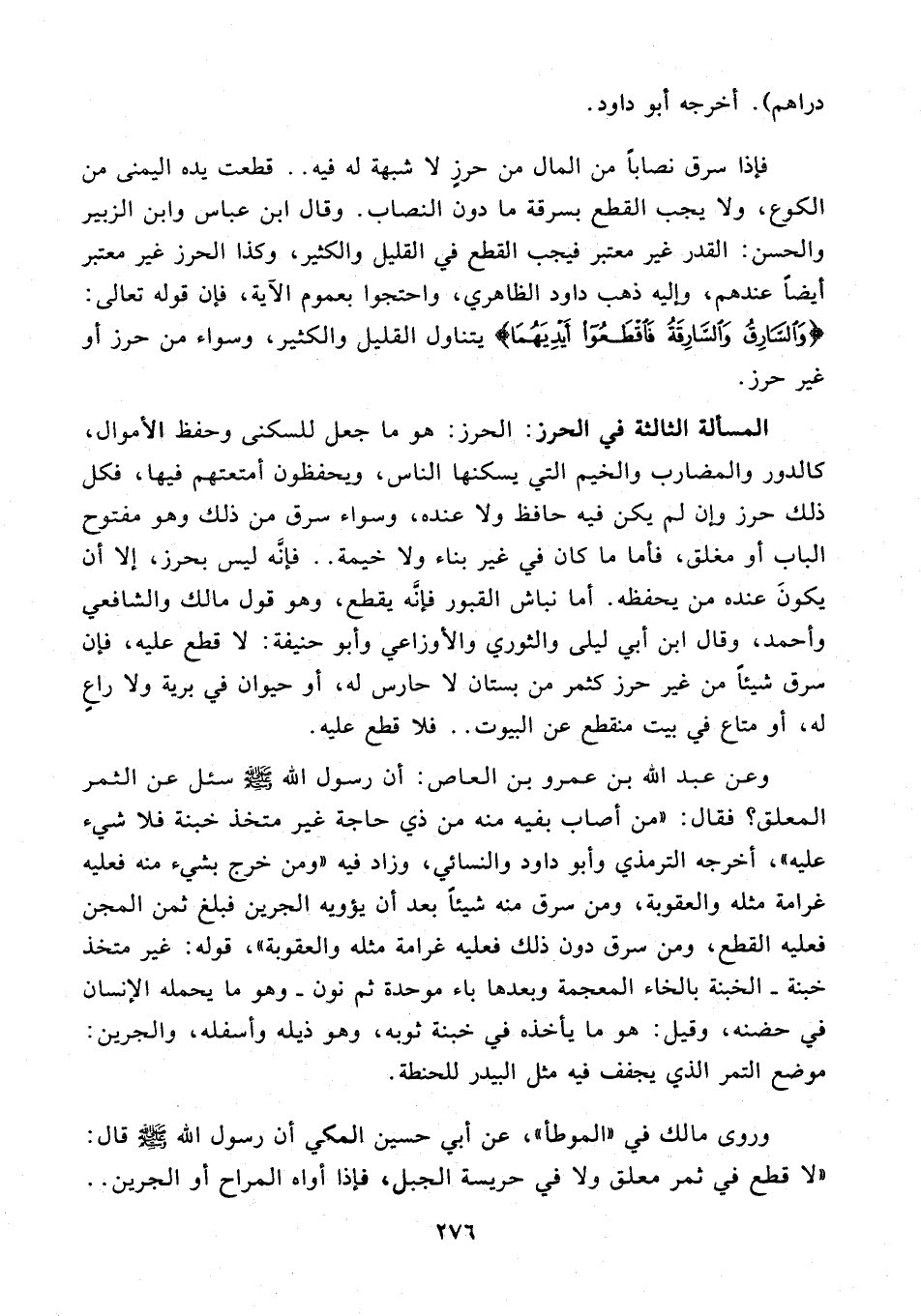 فإذا سرق نصابًا من المال من حرزٍ لا شبهة له فيه .. قطعت يده اليمنى من الكوع، ولا يجب القطع بسرقة ما دون النصاب. وقال ابن عباس وابن الزبير والحسن: القدر غير معتبر فيجب القطع في القليل والكثير، وكذا الحرز غير معتبر أيضًا عندهم، وإليه ذهب داود الظاهري، واحتجوا بعموم الآية، فإن قوله تعالى: {وَالسَّارِقُ وَالسَّارِقَةُ فَاقْطَعُوا أَيْدِيَهُمَا} يتناول القليل والكثير، وسواء من حرز أو غير حرز.