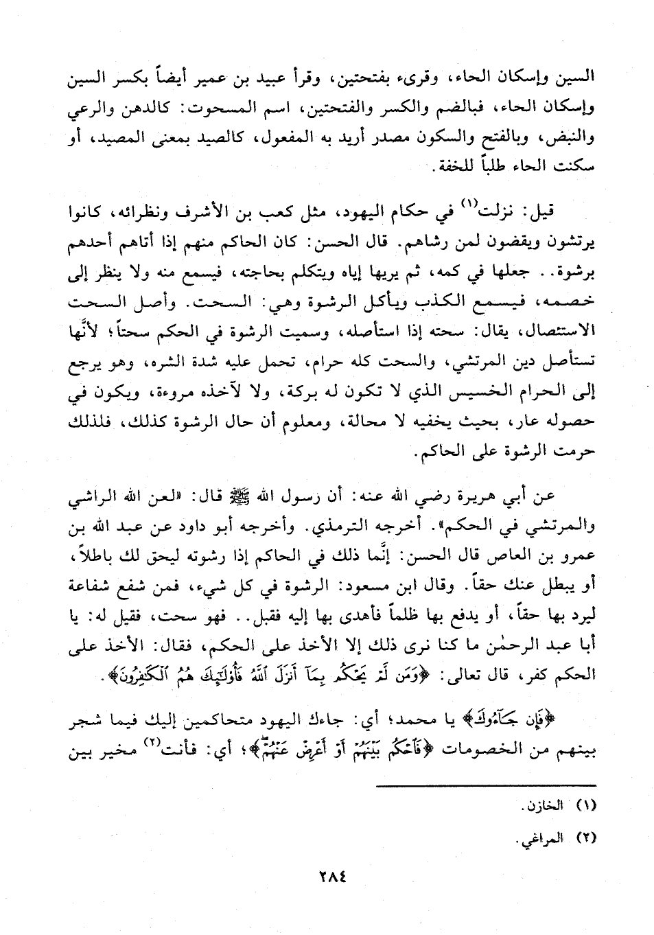 قيل: نزلت (¬1) في حكام اليهود، مثل كعب بن الأشرف ونظرائه، كانوا يرتشون ويقضون لمن رشاهم. قال الحسن: كان الحاكم منهم إذا أتاهم أحدهم برشوة .. جعلها في كمه، ثم يريها إياه ويتكلم بحاجته، فيسمع منه ولا ينظر إلى خصمه، فيسمع الكذب ويأكل الرشوة وهي: السحت. وأصل السحت الاستئصال، يقال: سحته إذا استأصله، وسميت الرشوة في الحكم سحتًا؛ لأنها تستأصل دين المرتشي، والسحت كله حرام، تحمل عليه شدة الشره، وهو يرجع إلى الحرام الخسيس الذي لا تكون له بركة، ولا لآخذه مروءة، ويكون في حصوله عار، بحيث يخفيه لا محالة، ومعلوم أن حال الرشوة كذلك، فلذلك حرمت الرشوة على الحاكم.
