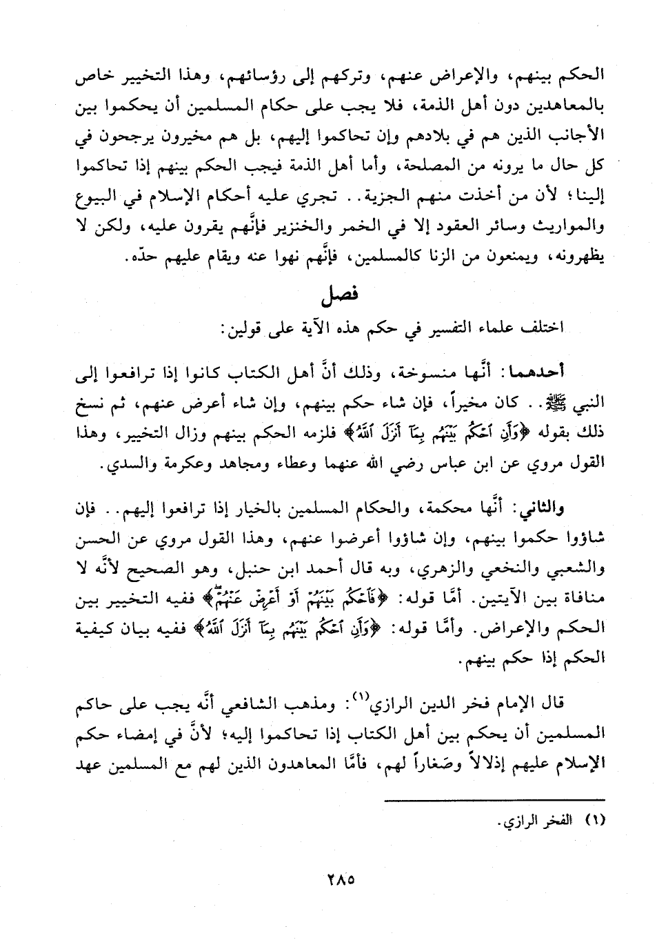 الحكم بينهم، والإعراض عنهم، وتركهم إلى رؤسائهم، وهذا التخيير خاص بالمعاهدين دون أهل الذمة، فلا يجب على حكام المسلمين أن يحكموا بين الأجانب الذين هم في بلادهم وإن تحاكموا إليهم، بل هم مخيرون يرجحون في كل حال ما يرونه من المصلحة، وأما أهل الذمة فيجب الحكم بينهم إذا تحاكموا إلينا؛ لأن من أخذت منهم الجزية .. تجري عليه أحكام الإِسلام في البيوع والمواريث وسائر العقود إلا في الخمر والخنزير فإنَّهم يقرون عليه، ولكن لا يظهرونه، ويمنعون من الزنا كالمسلمين، فإنَّهم نهوا عنه ويقام عليهم حدّه.